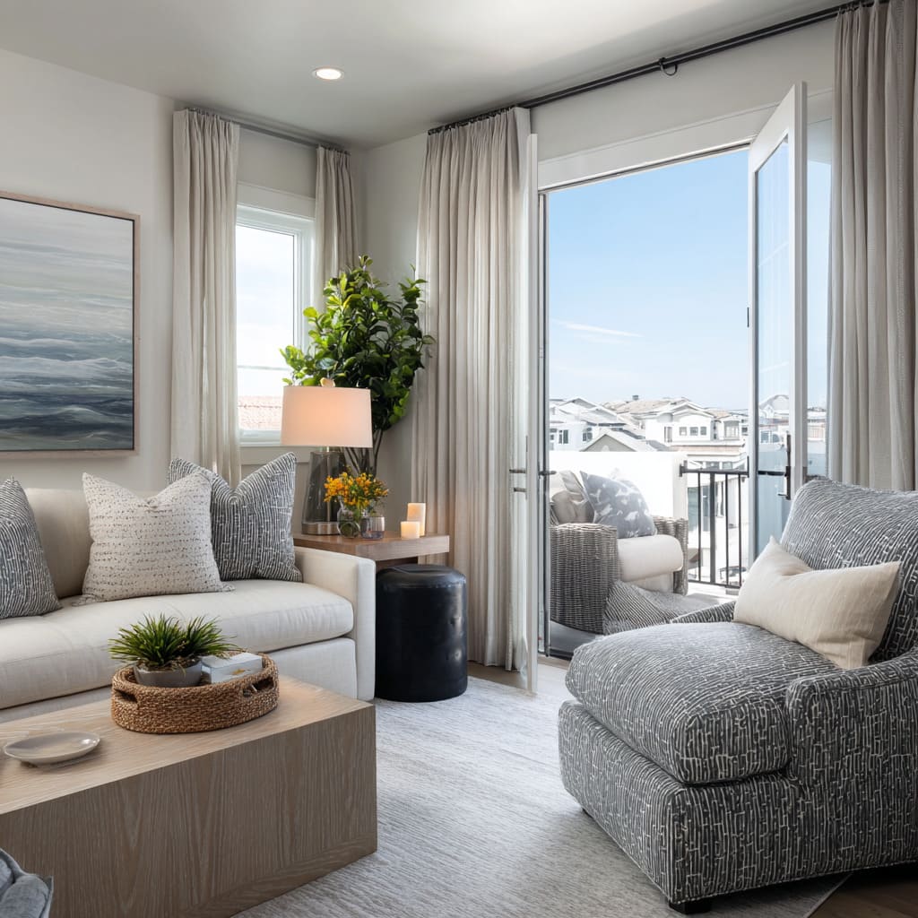 • Low, horizontal styling on tables (books, trays, shallow bowls) preserves sightlines and keeps the room calm.