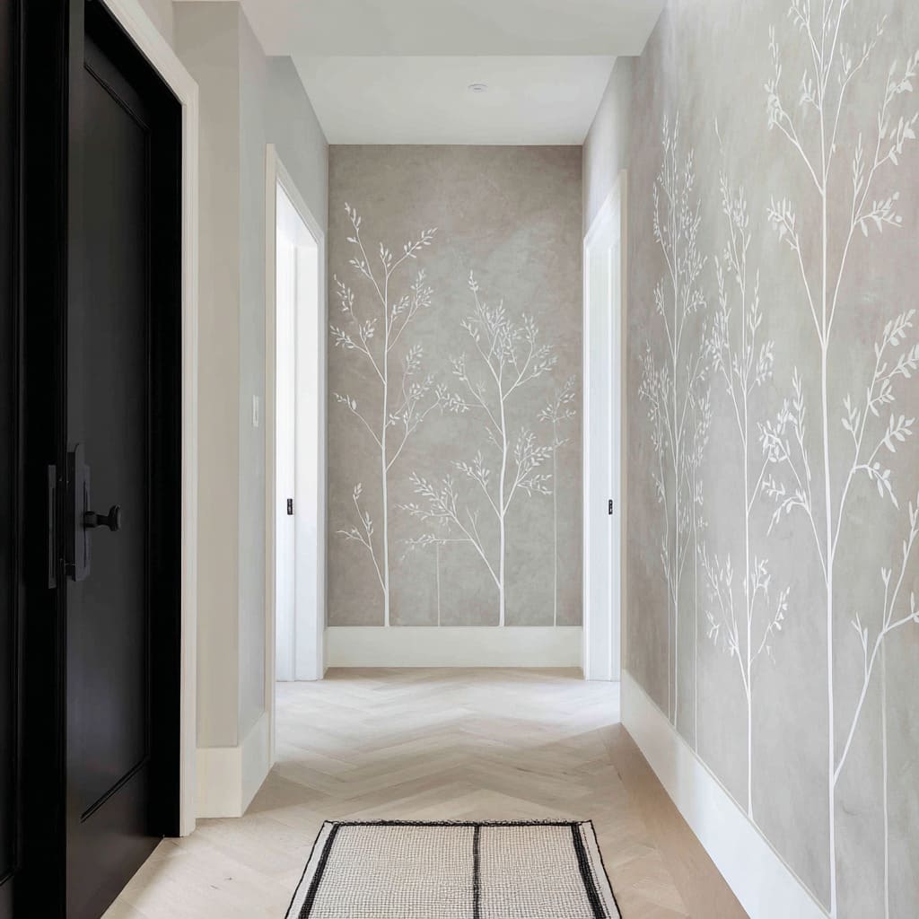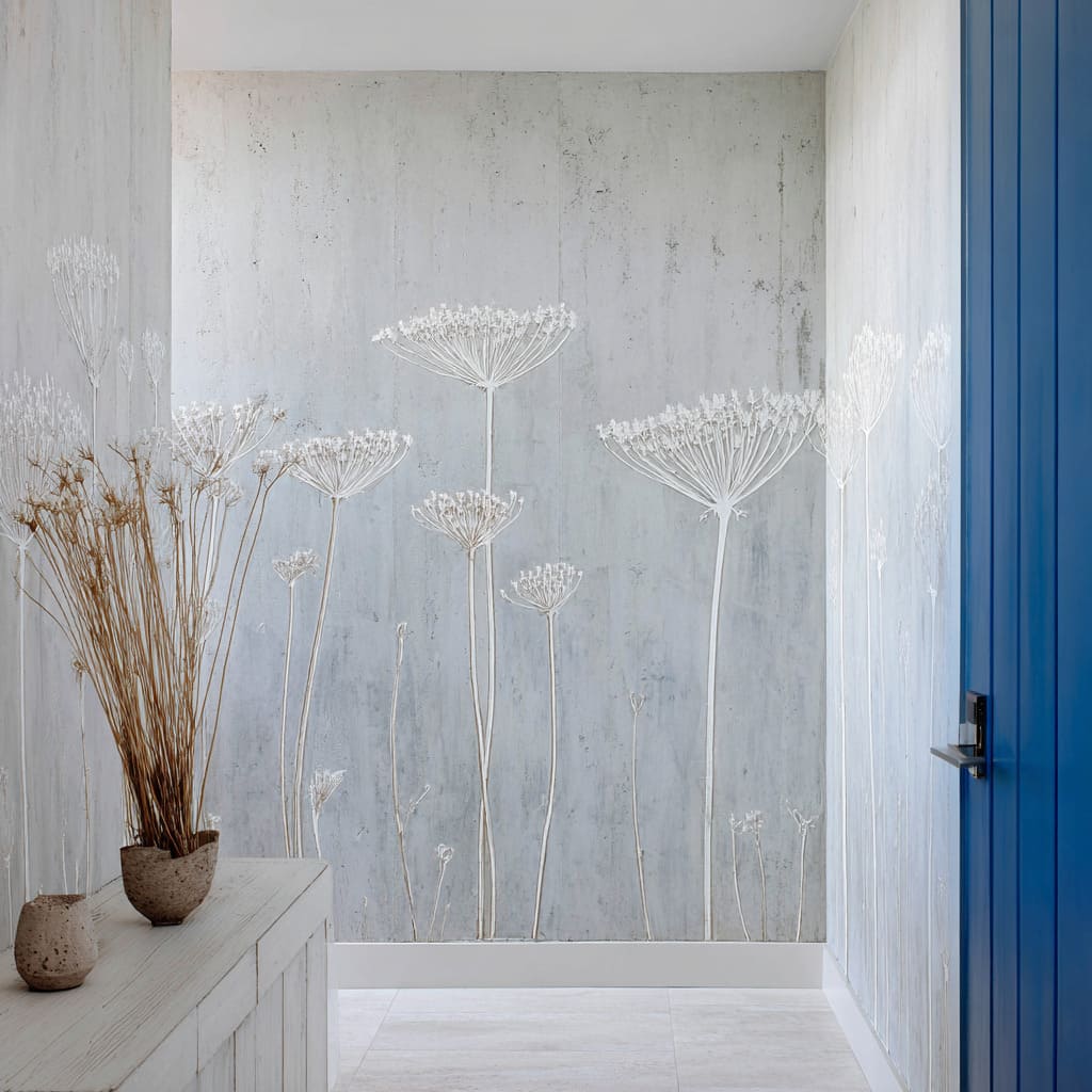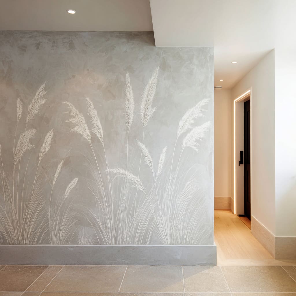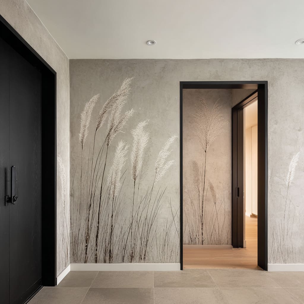 A soft grass or plume motif can read quietly dramatic when framed by a crisp, dark doorway or casing. The wall begins to feel like a composed scene—foreground softness, mid-depth shadow, and a second plane beyond.