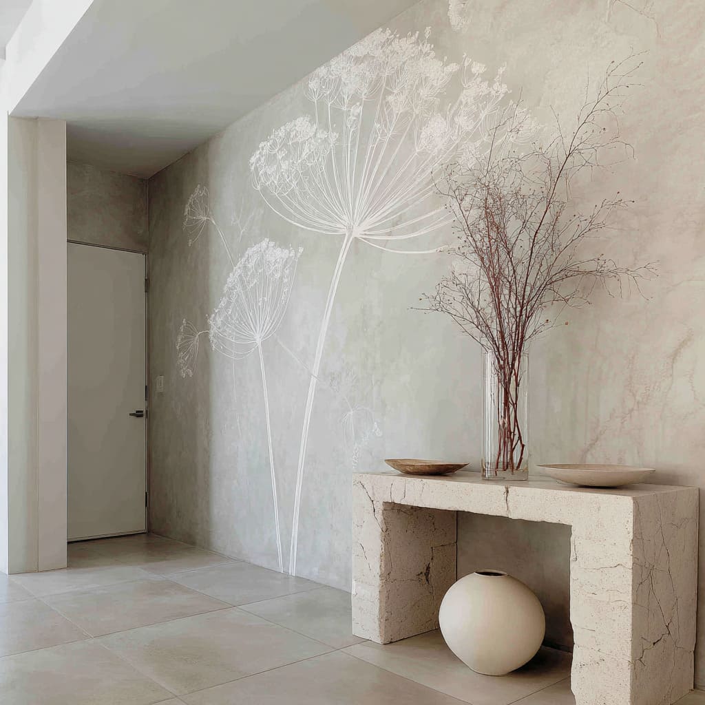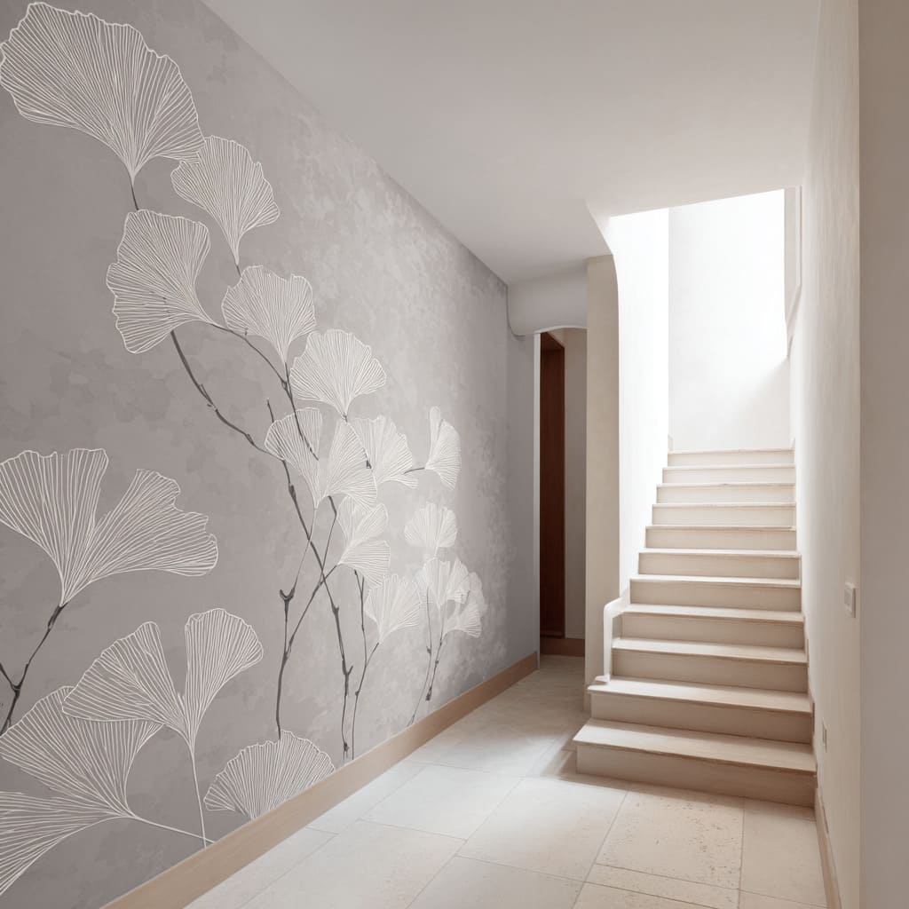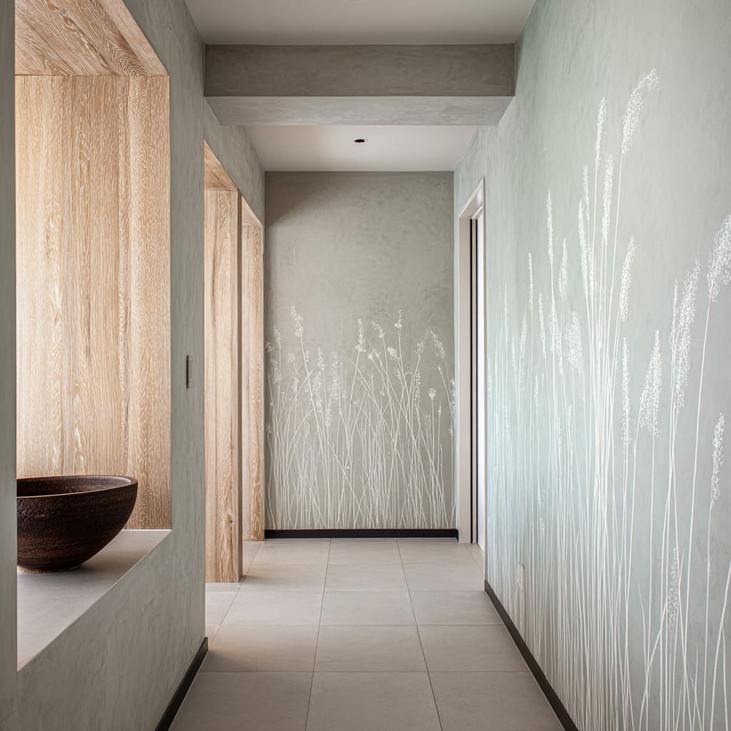 Botanical minimalism in circulation space designs tends to feel high-end when the wall behaves like atmosphere first and the plant marks behave like rhythm, spacing, and scale rather than “artwork. ” The strongest results come from a controlled hierarchy: soft surface fields, disciplined linework, a few anchoring edges, and one or two tactile notes that keep the space human.
