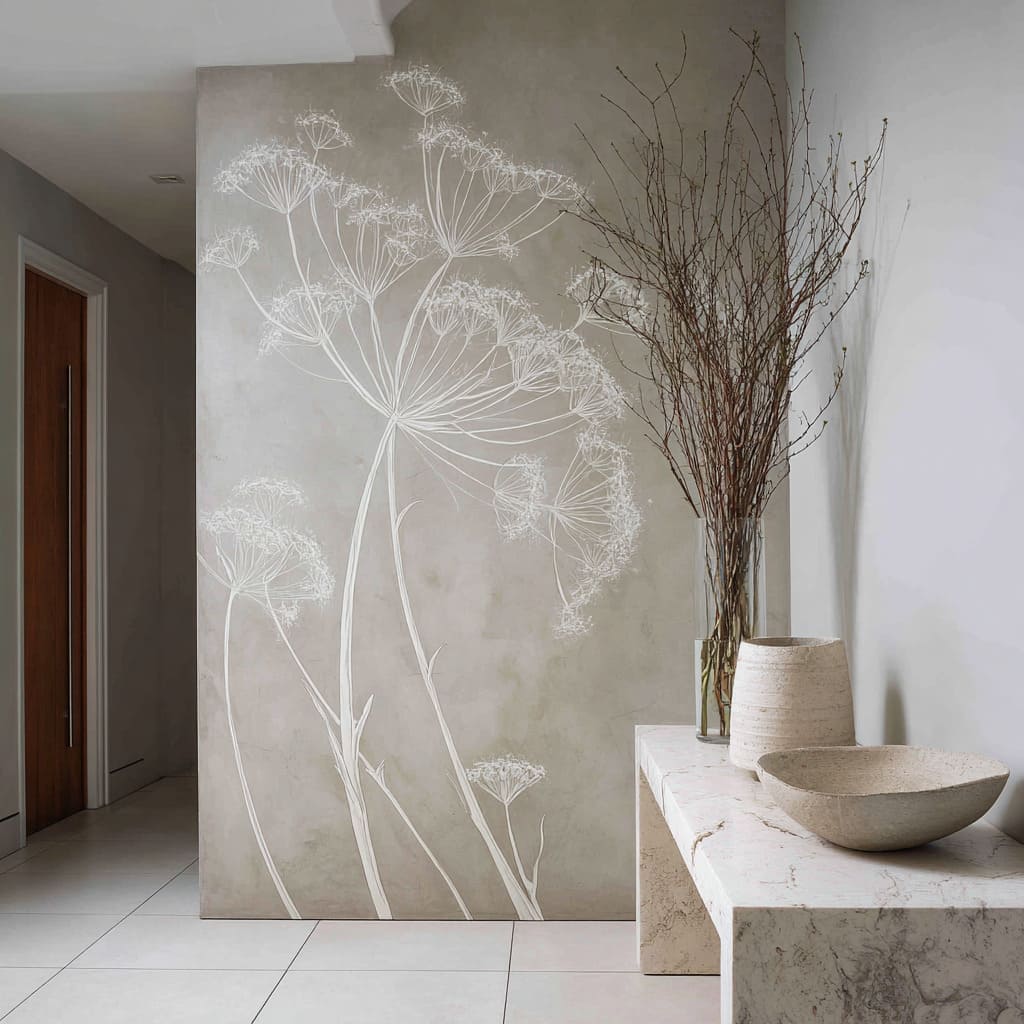- Veil-like botanicals: Lace heads and airy umbels read as “air” when rendered lightly, which keeps the wall from becoming a pattern and allows bold punctuation to stay clean.