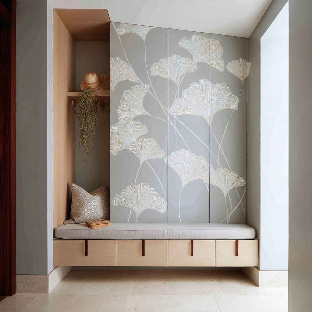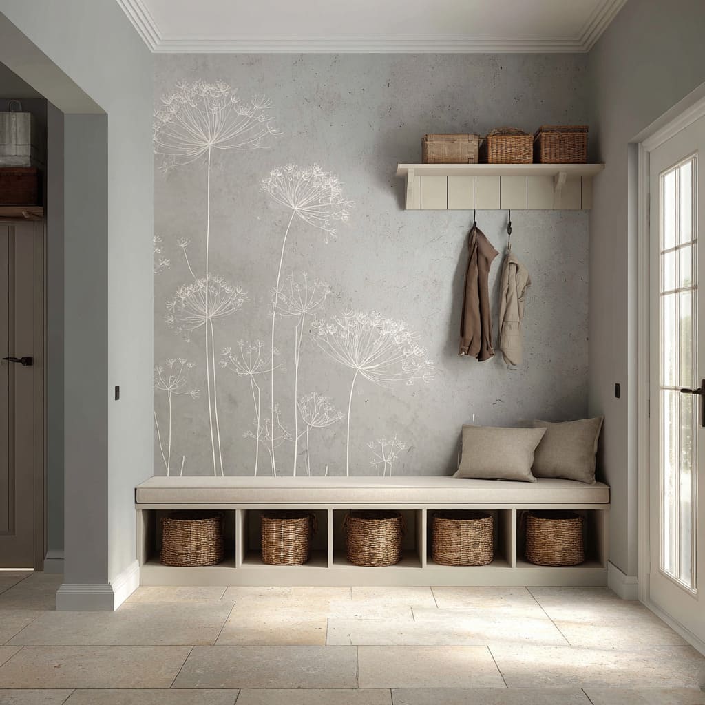 A functional entry can remain refined when the botanical wall is treated as the airy visual layer, while baskets, hooks, and coats carry the tactile and practical layer. Calm is preserved because each layer has a clear job.