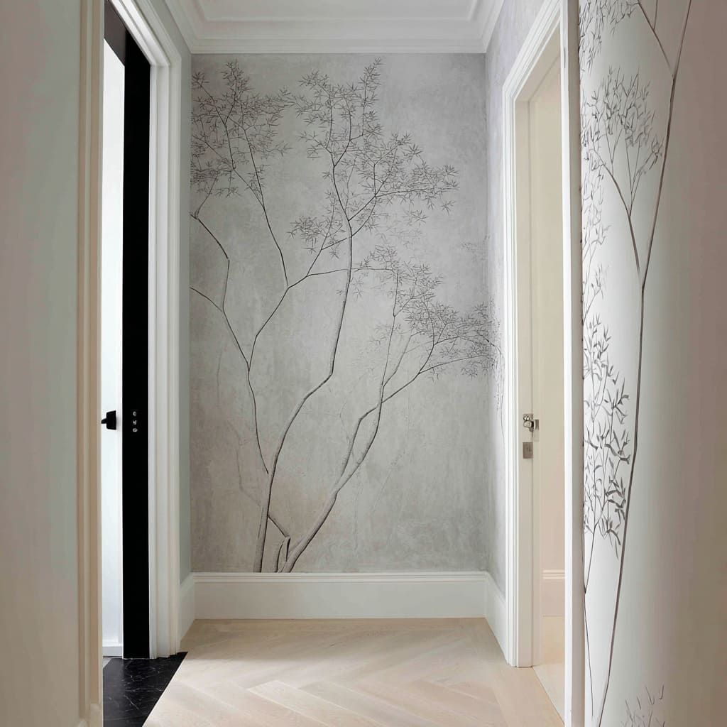 Fan-leaf forms can create a drifting panorama along a corridor wall. The space feels guided and continuous, with richness coming from line texture rather than color.
