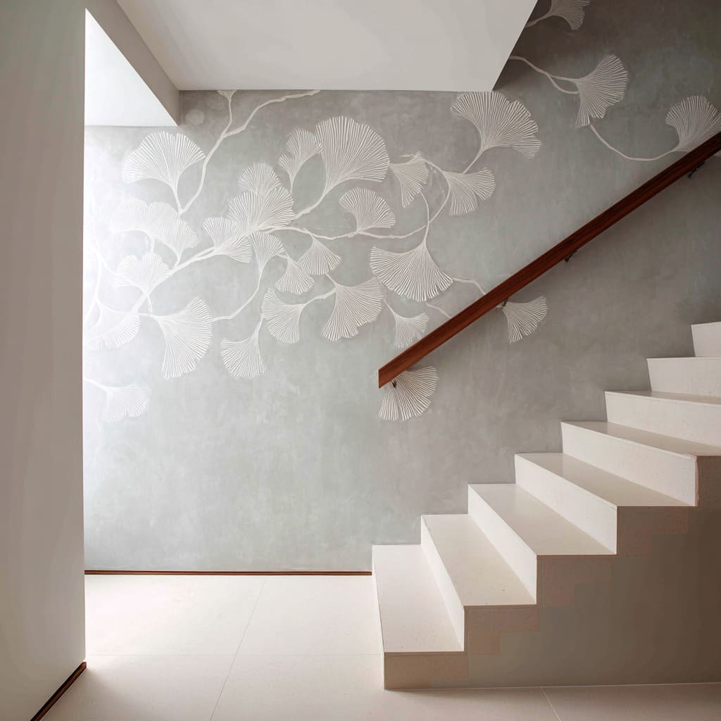 - Density tapering upward: Botanical clusters that thin out toward upper zones open the stairwell visually and reduce heaviness.