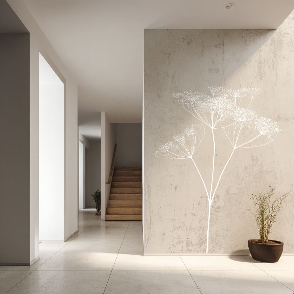 In many feature hallway wall compositions, the most important decision is not the plant type—it’s the discipline of spacing, cropping, and contrast roles. That discipline is what separates soft botanical minimalism from a themed mural look and is the core engine behind feature wall hallway ideas that read calm, architectural, and quietly memorable.