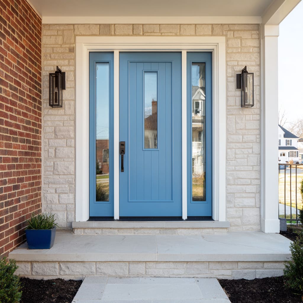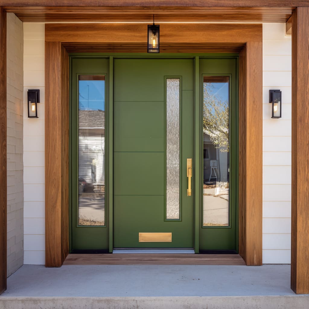The visible base of the entry has outsized influence on whether the door reads airy, stable, modern, or casual. The floor and step edges can do a quiet job: