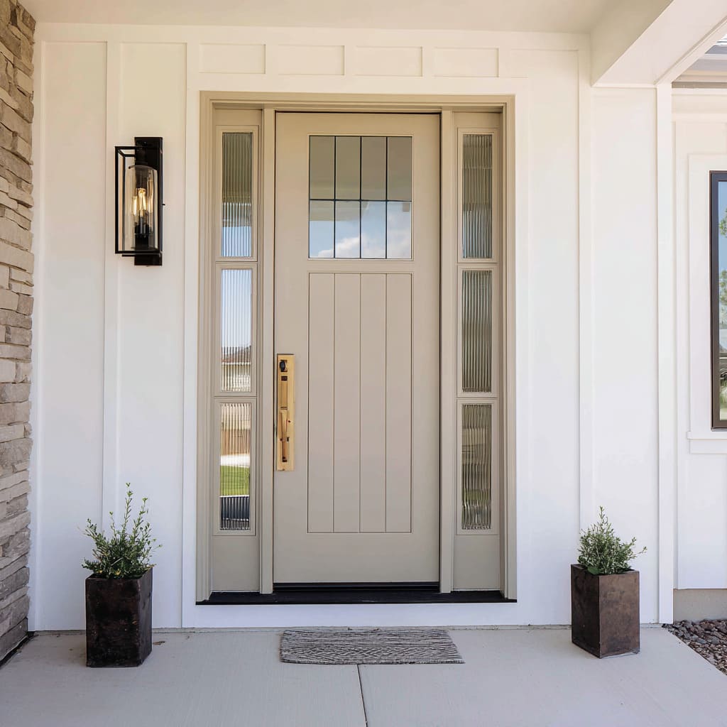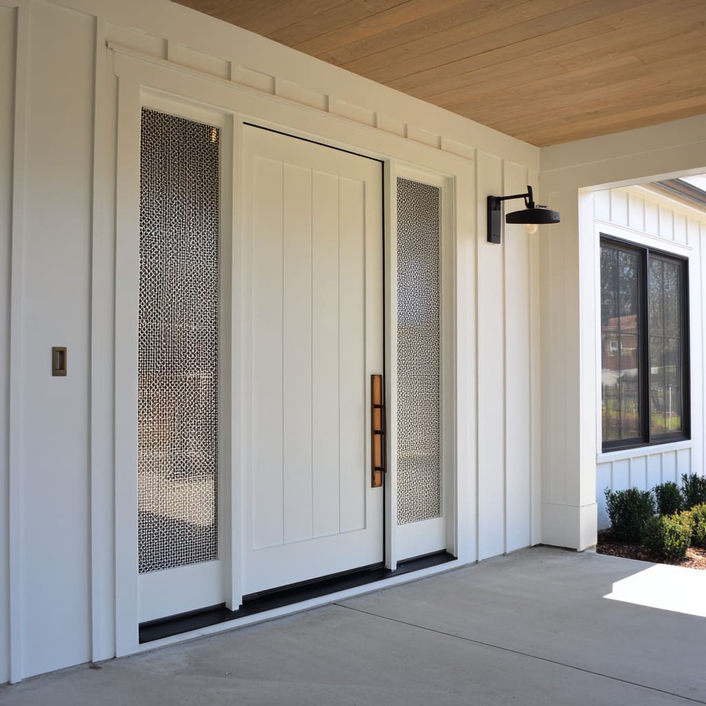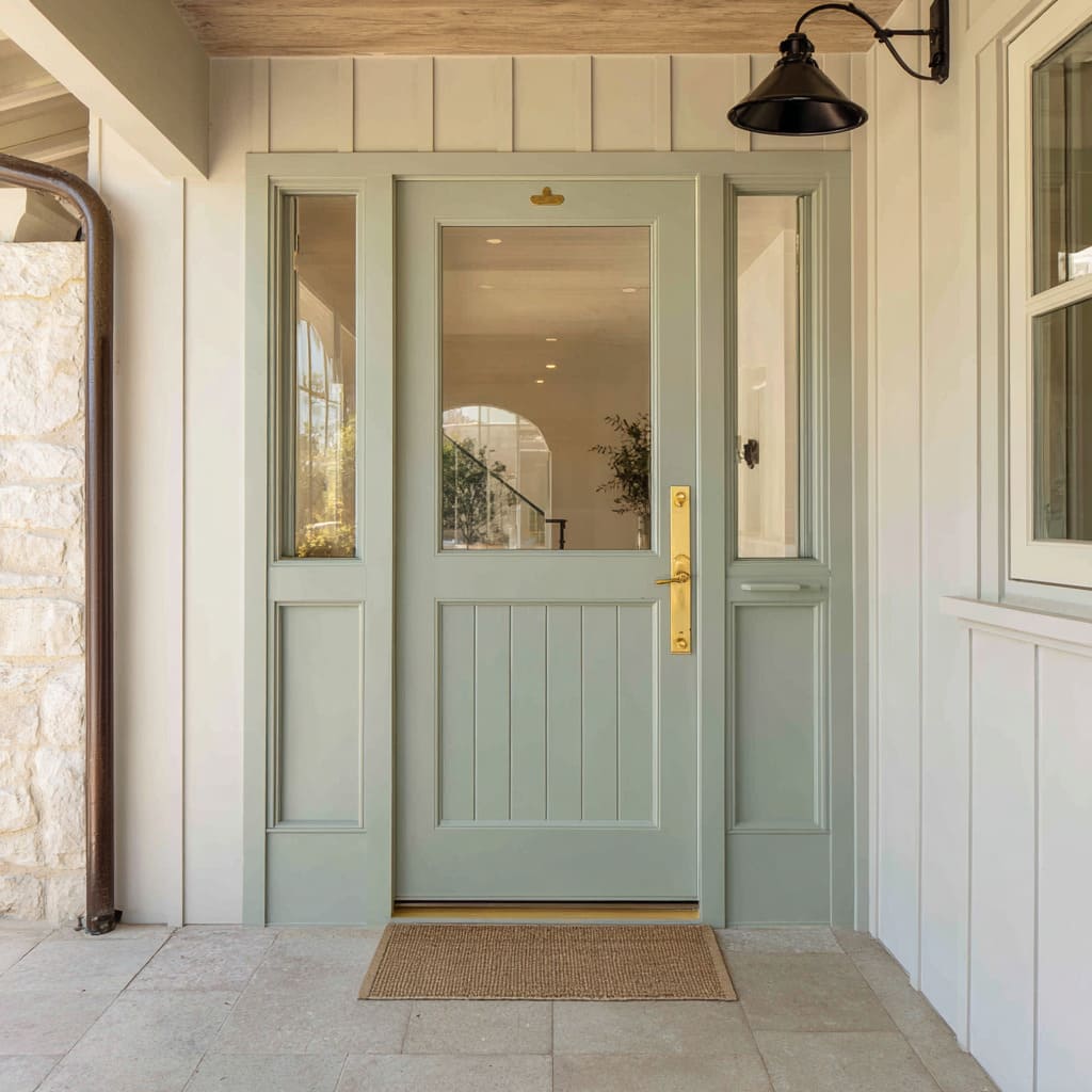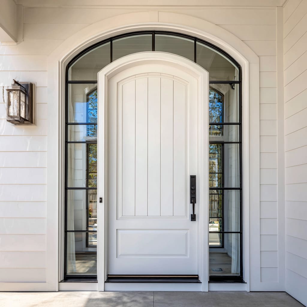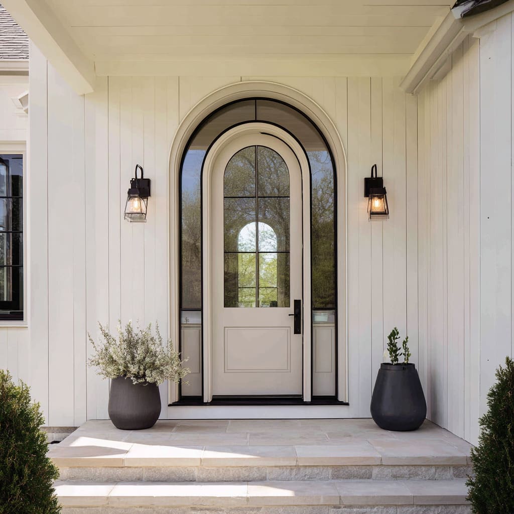 This is one of the clearest patterns inside modern farmhouse front door ideas: shape does the heavy lifting first, and color stays quiet so the entry remains calm in every season.