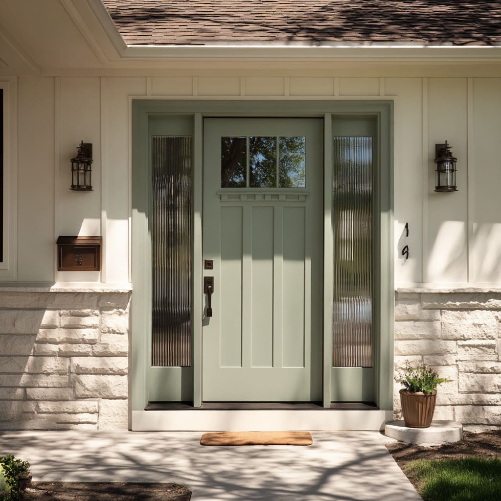 A design point: textured glass often becomes the “movement” in an otherwise still entry. During the day, it changes with sun angle; at night, it becomes a lantern-like surface.