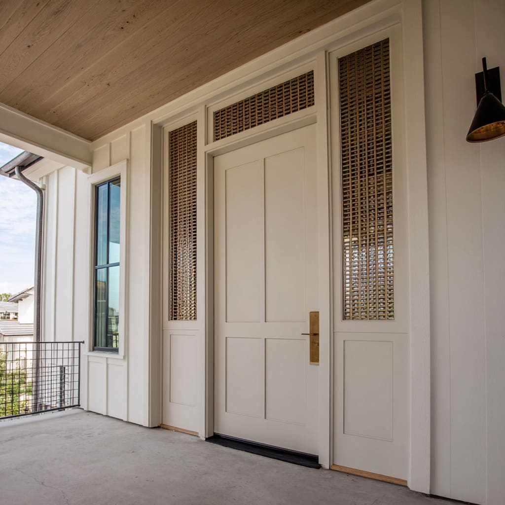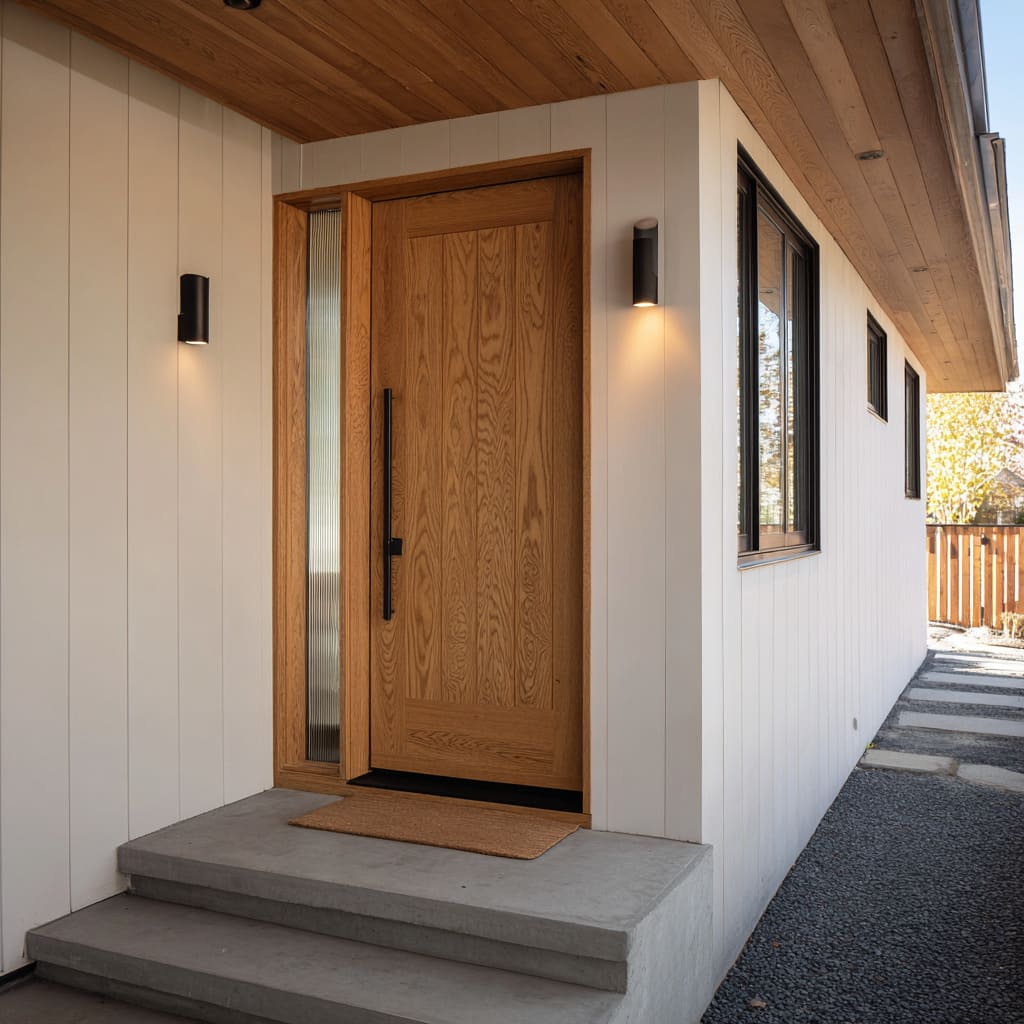 One of the most underestimated moves is keeping the door close in color to the siding—then separating them with direction and texture instead of paint contrast. A warm white door next to warm white wall can still stand apart when: