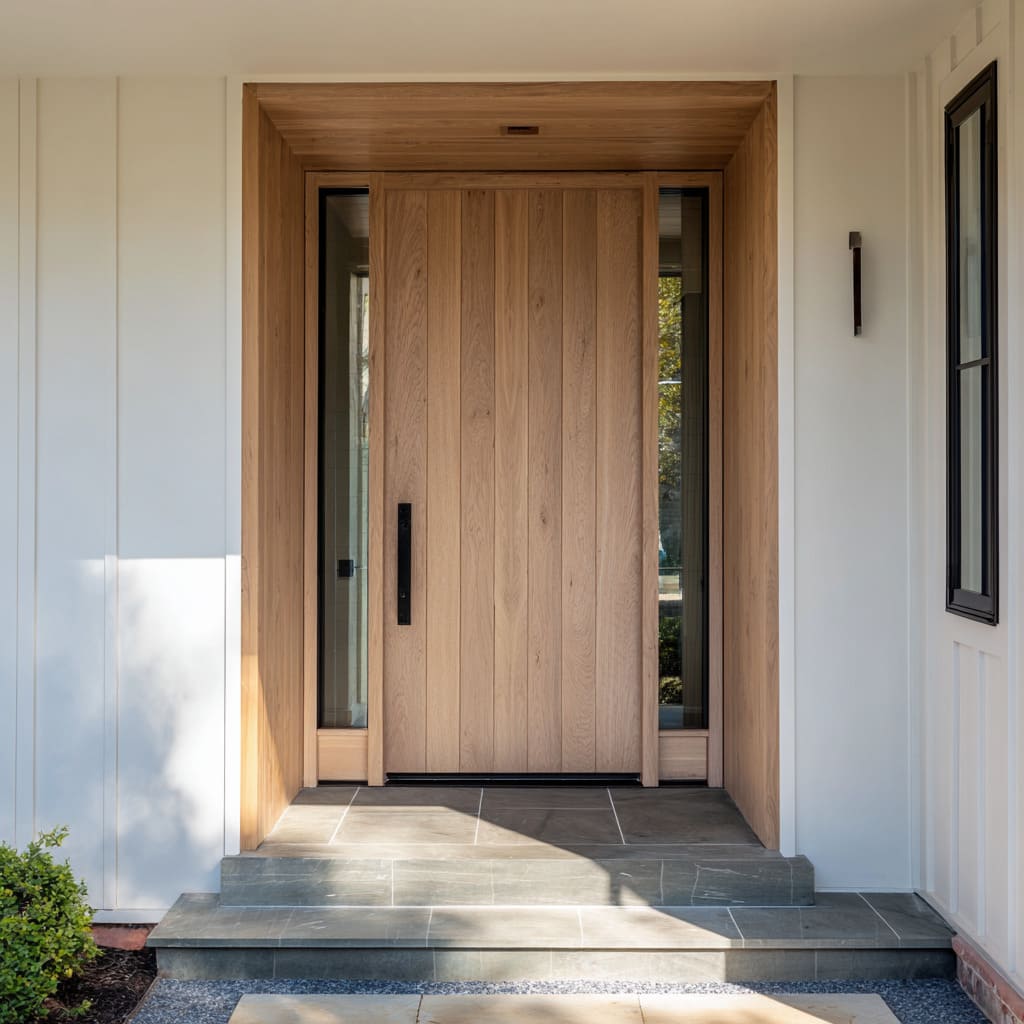 The recessed wood-lined entry design is one of the most telling examples of modern farmhouse becoming quietly high-end. The effect isn’t about the door face alone—it’s about how the door sits inside a pocket of shadow and warmth.