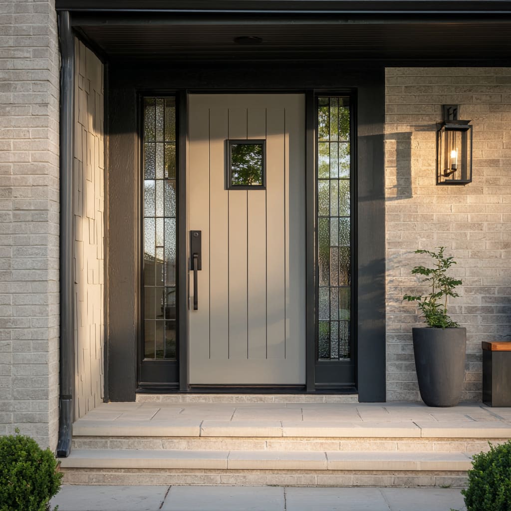 Because they sit back in a recess, they read darker and calmer, acting more like vertical light seams than windows meant for viewing. - Ribbed (reeded) sidelight: textured privacy.