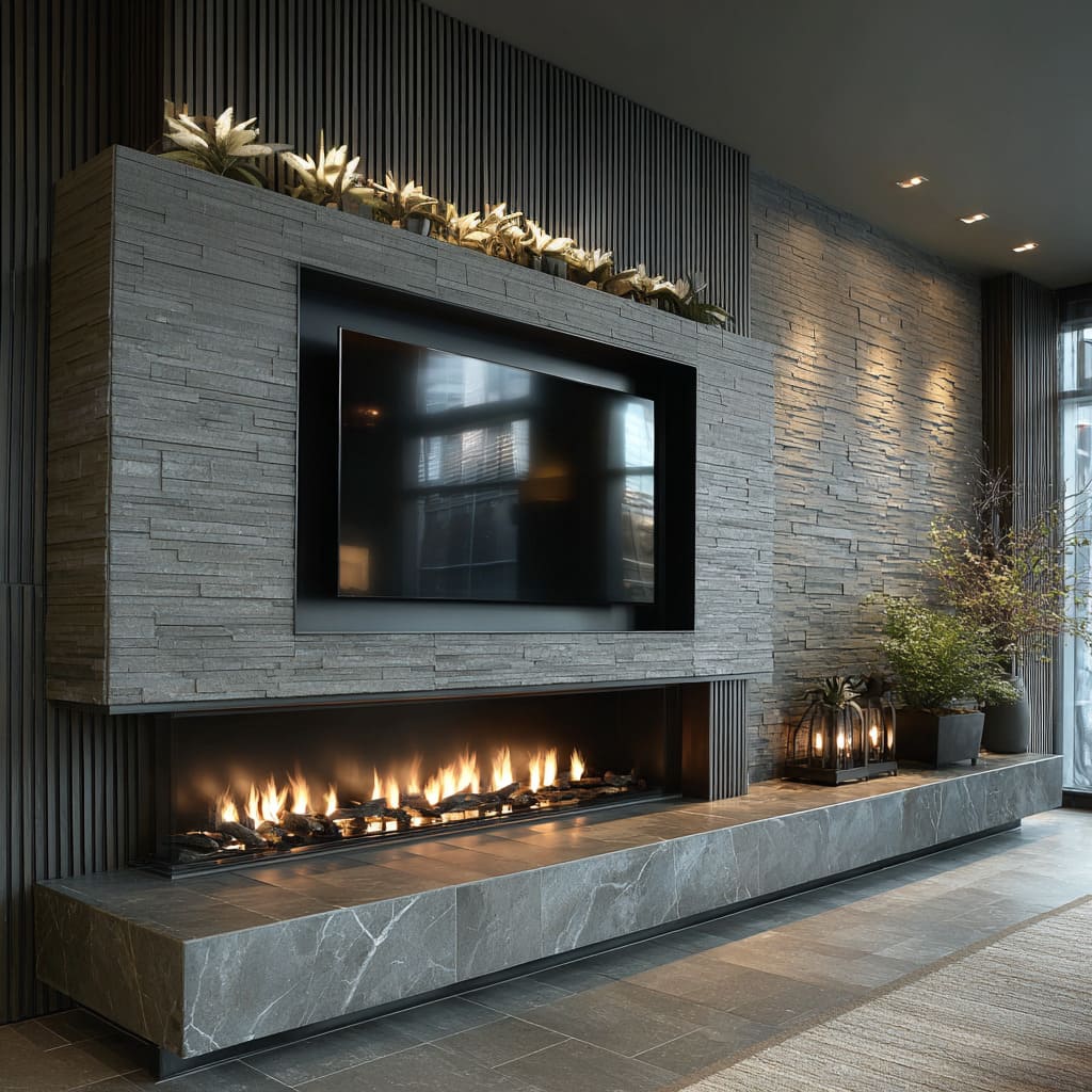 This is why modern stone fireplace ideas often include one vertical element near the composition: it prevents the wall from feeling like a long horizontal stripe with a big black screen.
