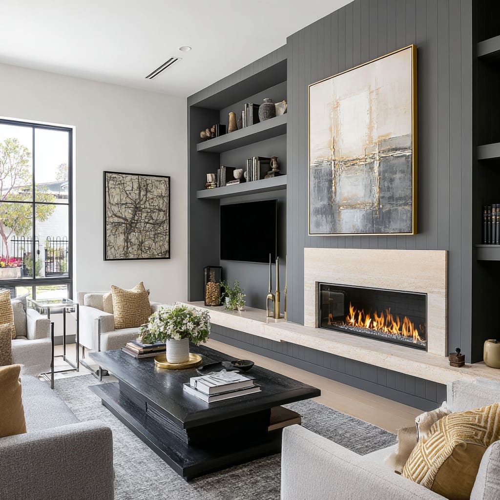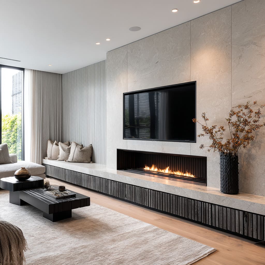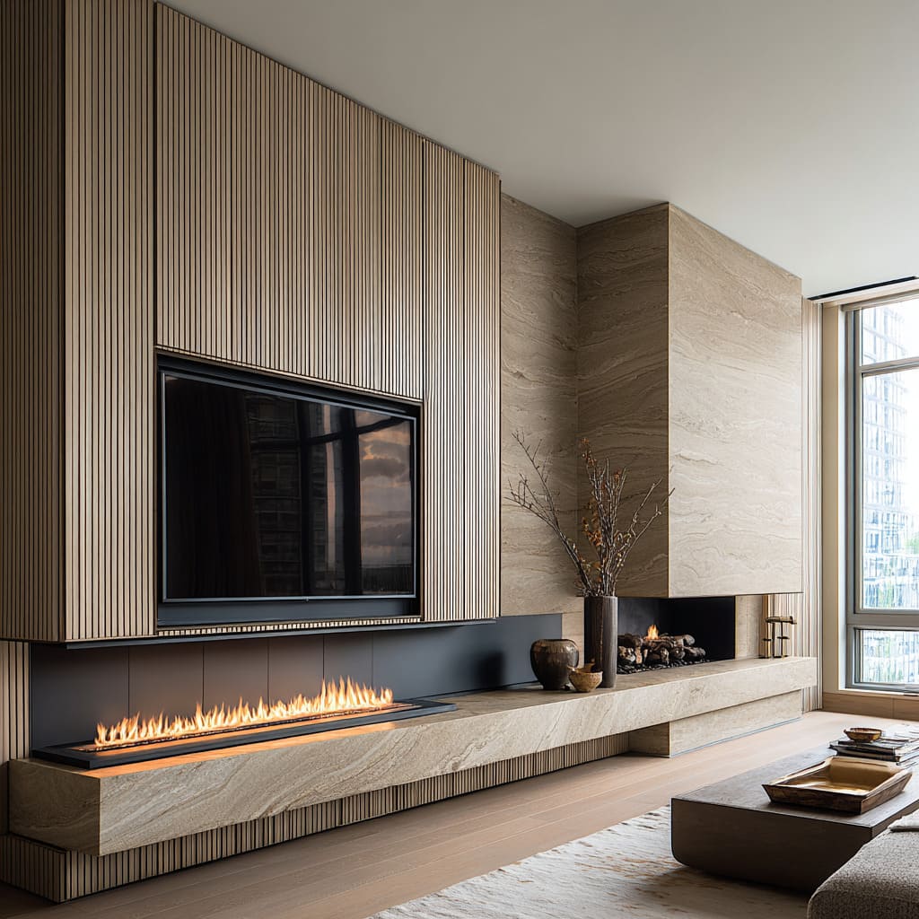 Tall shelving niches or vertical slat panels act as counterweights that stop a long linear fire from stretching the wall visually. They also break up the wall’s scale, which prevents the TV and fireplace from becoming the only readable items.
