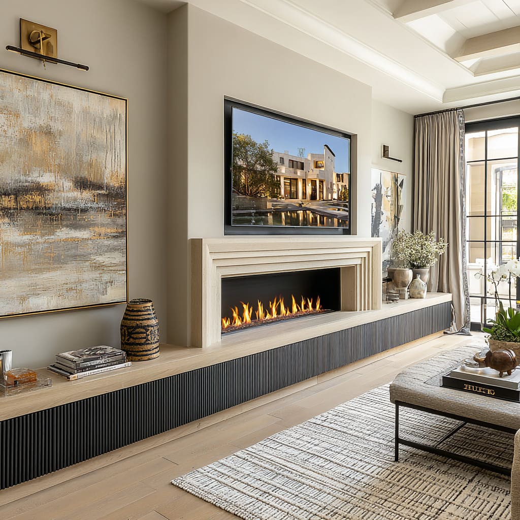 A continuous horizontal media line (a long ledge or base that ties fireplace and TV zones into one system) can make the wall feel complete by itself. It creates a compositional rule that everything else follows: