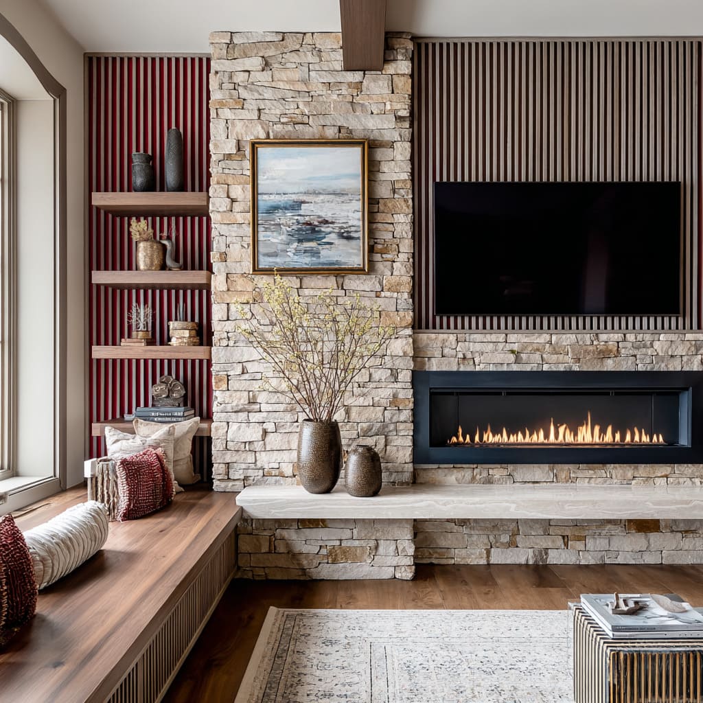 Many successful stone accent wall with fireplace compositions include a second texture that is more disciplined than stone—often vertical slats or ribbing.
