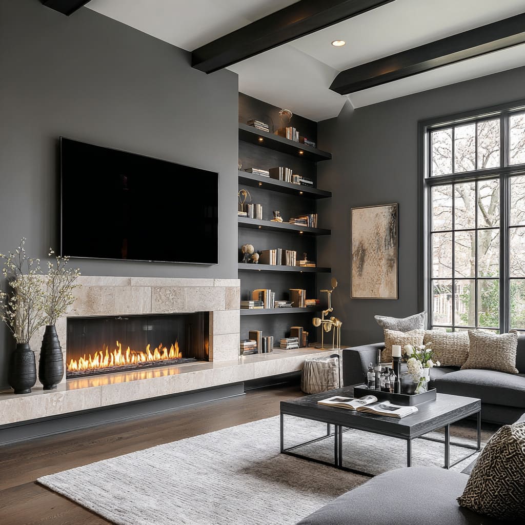 - Crisp black boundaries. A black firebox opening and, often, black window frames or black niche voids give the wall sharpness. Sharpness is what stops stone from drifting into cozy-lodge styling.