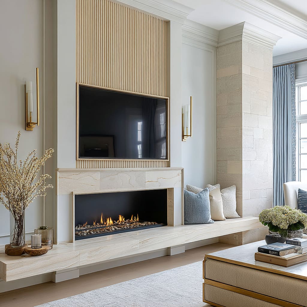 - A bench-like ledge that runs under the fireplace and continues outward makes the feature feel anchored. The fireplace stops floating as a separate box and becomes part of a grounded platform.