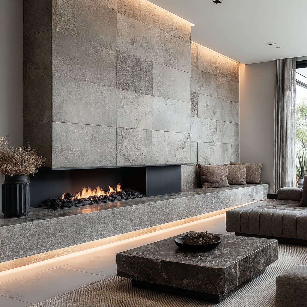 In the most minimal modern stone fireplace ideas, stone is divided into large panels with clear seams. Those seams create a quiet grid that makes the wall feel designed even if the mantel is nearly empty and the styling is restrained.