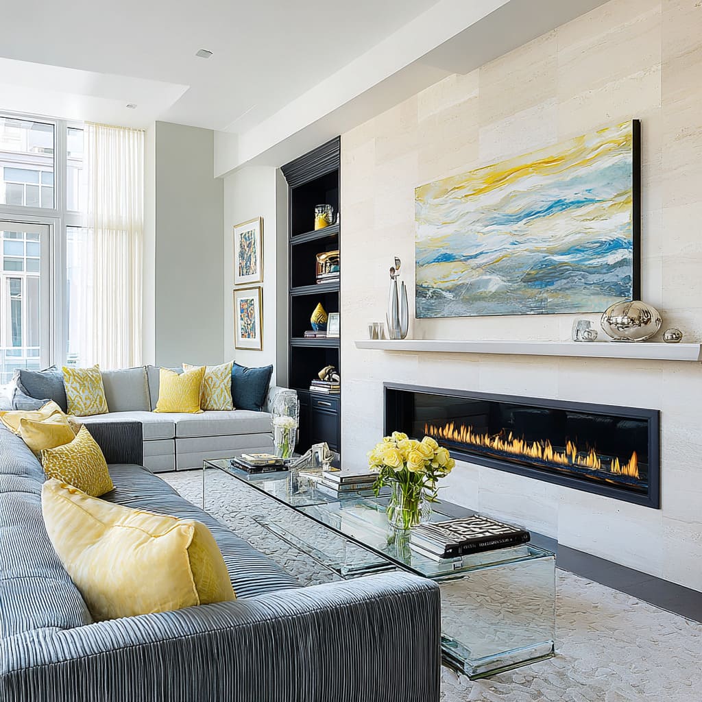 These moves also connect to yellow: in many stone fireplace living room ideas, yellow appears as warm glow (firelight, niche light, candle-like highlights), which reads richer than bright yellow decor.