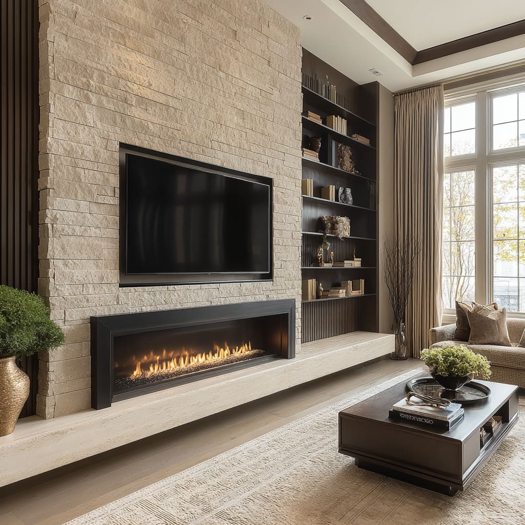 A refined stone wall often acts as a supporting plane that makes the fireline, the TV rectangle, and art read crisp. The stone doesn’t need to be dramatic if it makes everything else look sharper, softer, or richer.