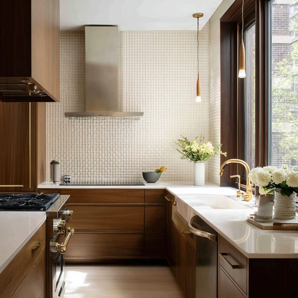 Cream pillowed square-tile backsplash design wrapping a corner to the ceiling, paired with walnut cabinetry