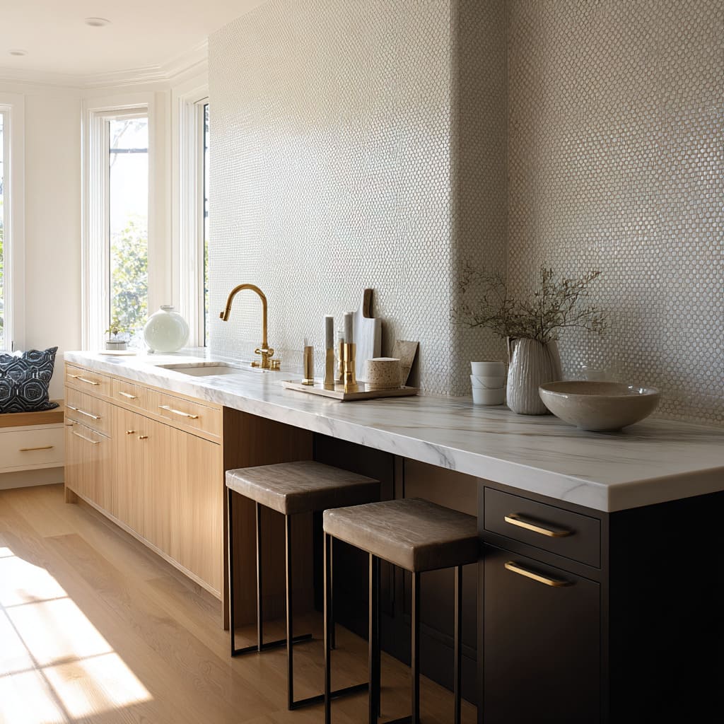 Among the most subtle creative backsplash ideas is the way designers use scale and texture instead of strong color. Large-format slabs and tiny modular tiles sit at opposite ends of the same strategy.