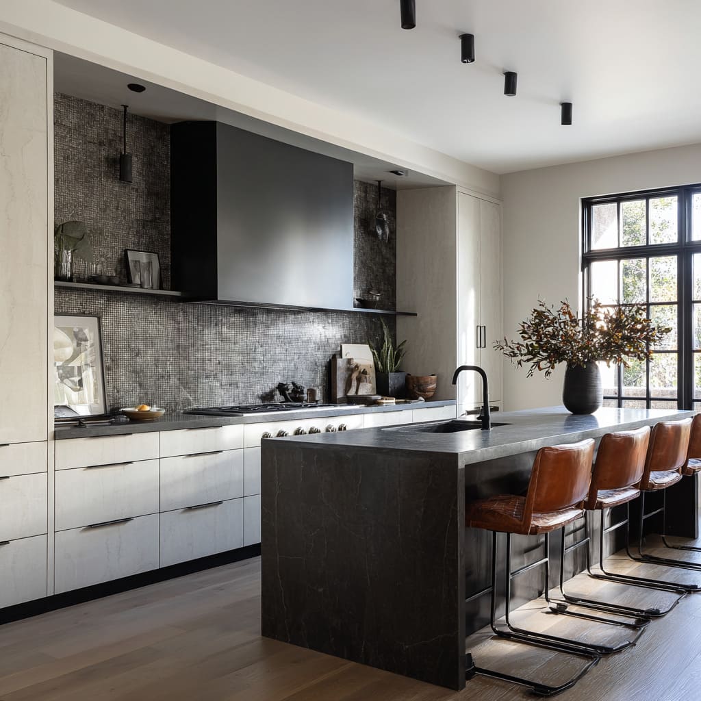 From a distance, the eye reads the dark backsplash as a steady vertical anchor and the island as the welcoming horizontal element where daily life gathers. Together they show how a backsplash can carry the mood of a room without relying on bright color, using tone, reflection, relief, and contrast with the seating block to create spaces that feel refined, intimate, and quietly expressive.