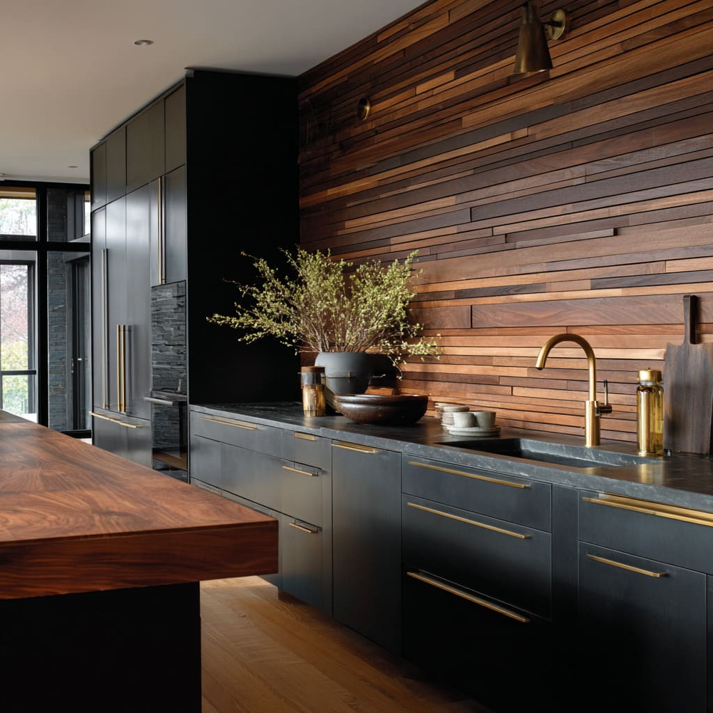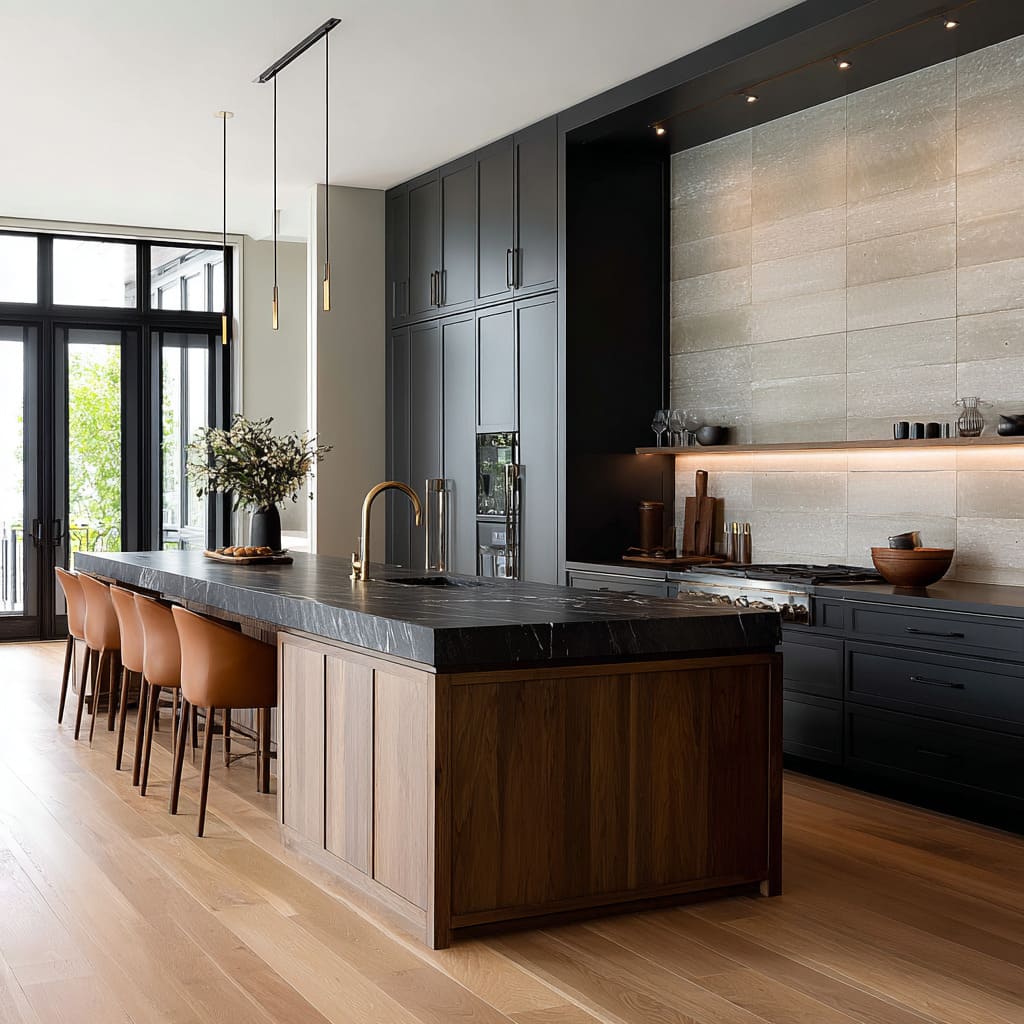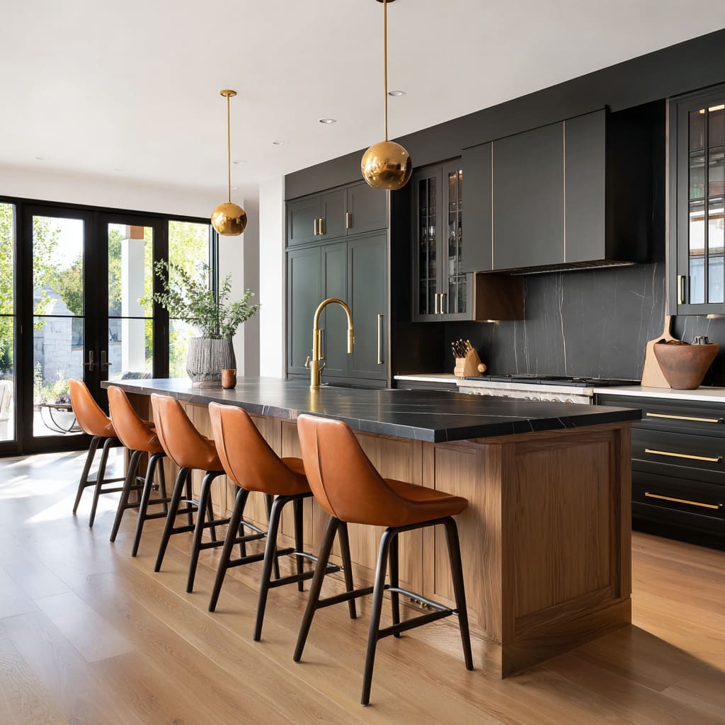 Against these dark planes, islands often appear in walnut, oak, or warm stone, paired with leather or fabric stools that introduce tactility at seating level. Brass faucets on the island echo the warm pulls on base cabinets beneath the dark backsplash, and globe pendants above the counter pick up the tones of metal mosaics or dark stone in faint reflections.