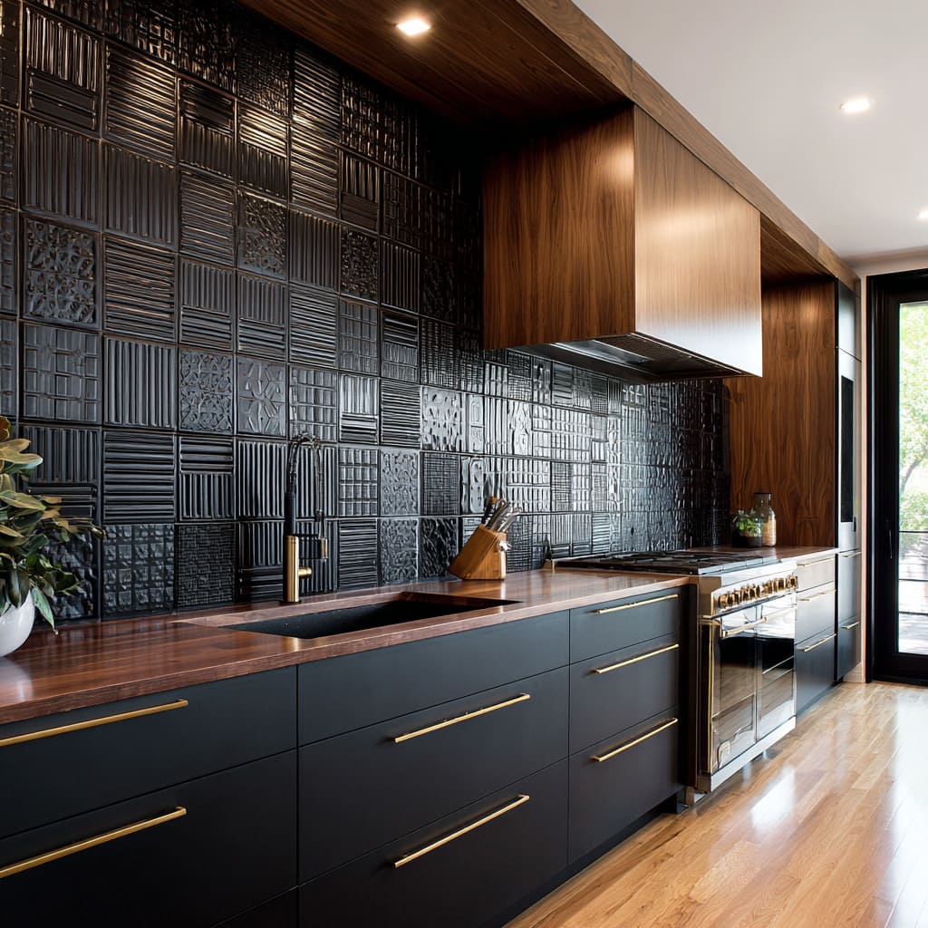 In some kitchen design concepts, each square tile carries a different relief—ribs, crosshatches, small dots—so the wall becomes a subtle tapestry where textures shift from tile to tile even though everything shares the same matte black tone. Under grazing light from ceiling spots or from one side window, some squares catch a soft sheen and others fall back, giving movement without changing any color.