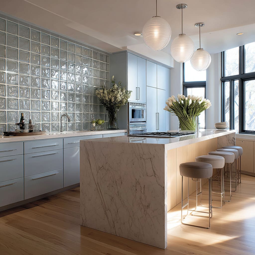 Nice blue-tinted glass block backsplash concept creating a diffused daylight wall behind pale cabinetry and a waterfall marble island