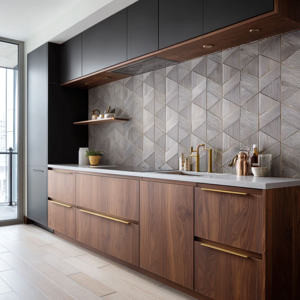 faceted champagne backsplash concept reflecting light in soft patterns beneath walnut uppers and charcoal drawers with brass hardware