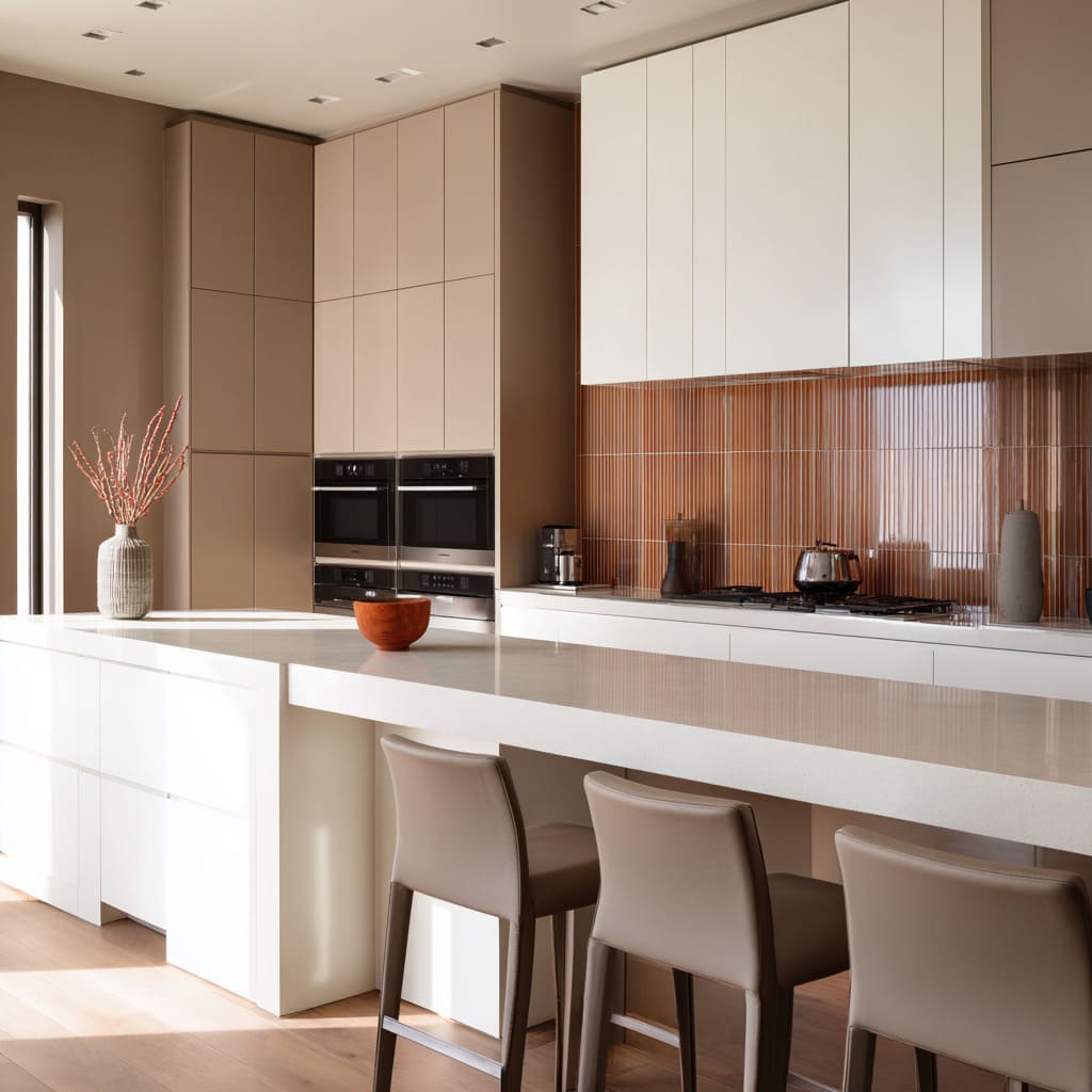 Terracotta vertical-rib tile backsplash design forming a warm central band between taupe towers and white counters in a calm neutral kitchen
