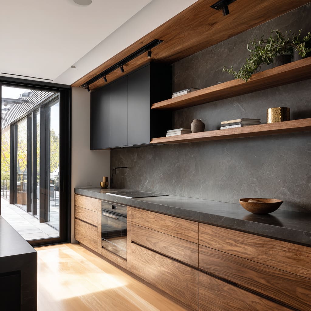 dark stone slab backsplash design with gentle veining, paired with long warm-wood shelves and matte black cabinets