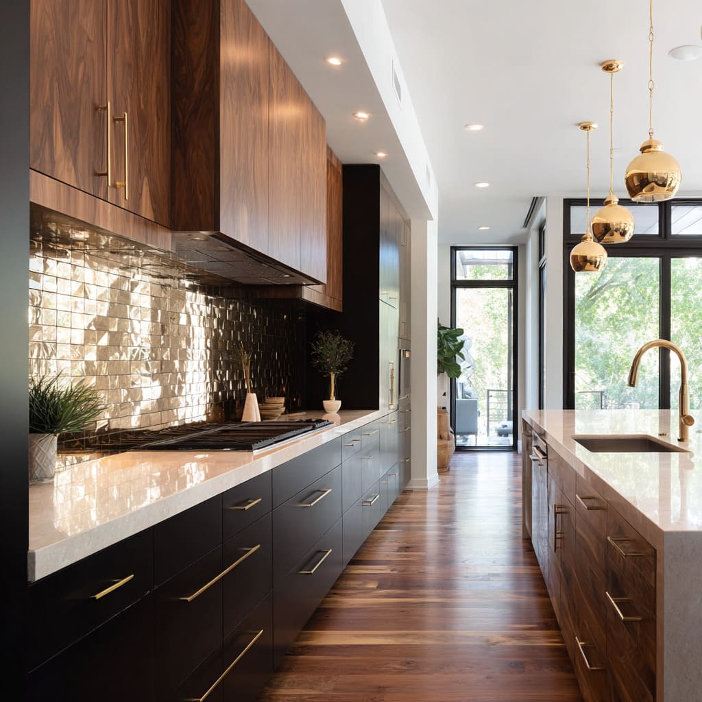 The grout nearly disappears, and what remains is a liquid strip of reflection that feels animated even when the kitchen is still. When such walls are paired with matte walnut cabinets and dark drawers, long brass pulls and gold pendants over the island act as calm companions; they echo the color of the backsplash in broader, quieter shapes.