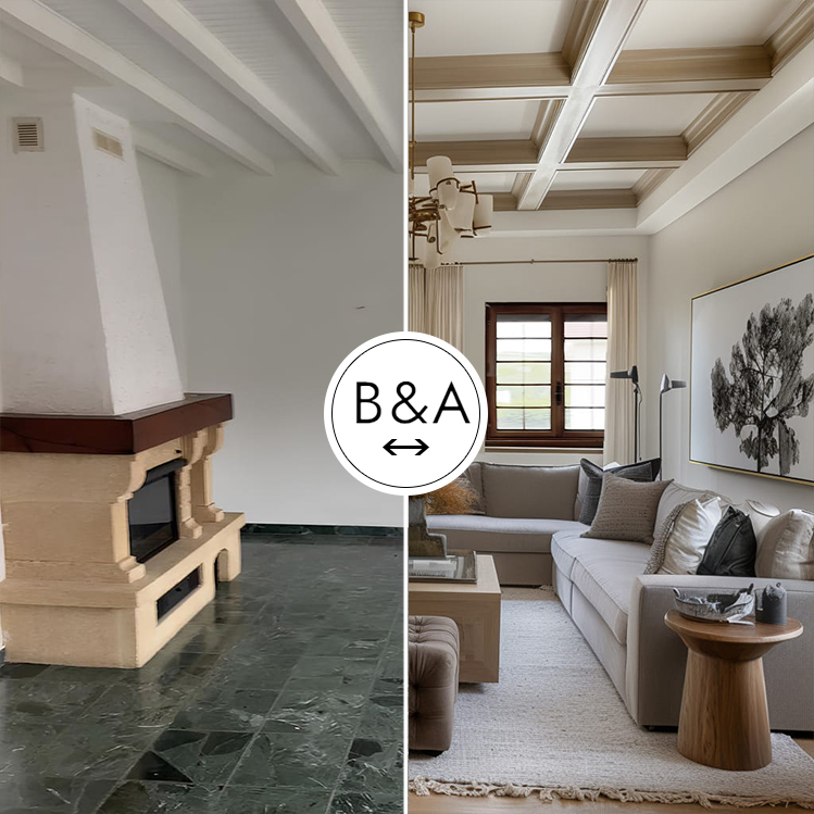 The original room, characterized by its marble flooring and neutral walls, provided a solid foundation for the redesign. The existing features, such as the fireplace and window, were integrated into the new designs, enhancing their functionality and aesthetic appeal.