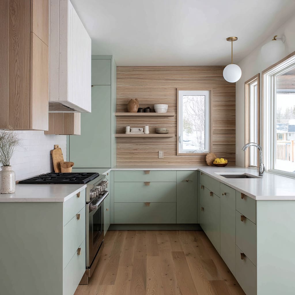 Some of the most understated backsplash ideas for sage green cabinets play with this exact tension. The cabinetry provides the steady field of color, while the backsplash carves a visual path: either outward for balance, or upward for lightness.