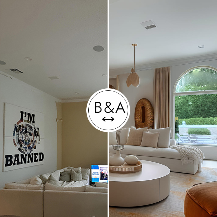 Initially, the room featured a large L-shaped sectional sofa in light beige, a low coffee table, and a prominent piece of wall art. The layout was simple, focusing on functionality with neutral tones, a large arched window, and sliding glass doors providing ample natural light and a connection to the outdoors.