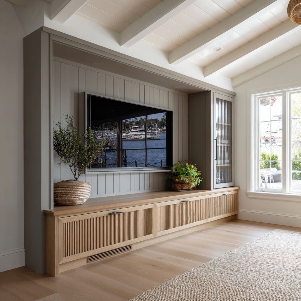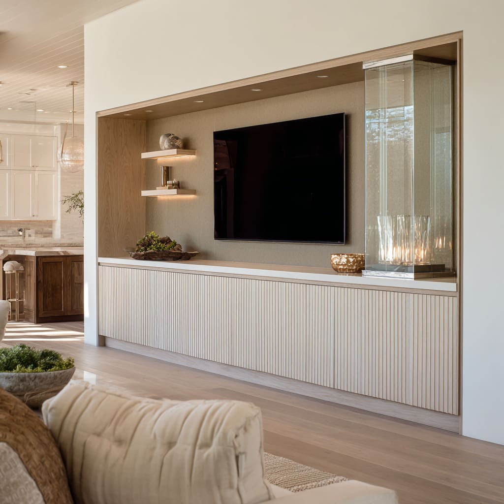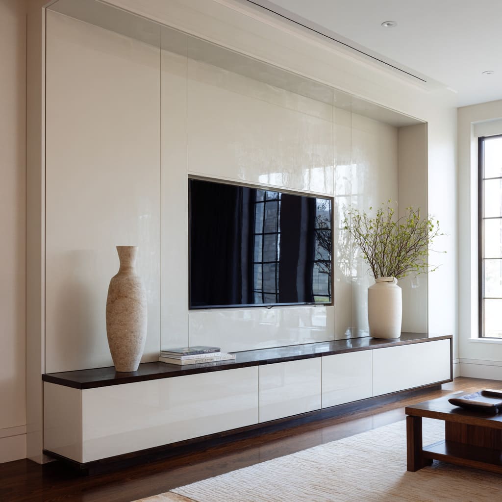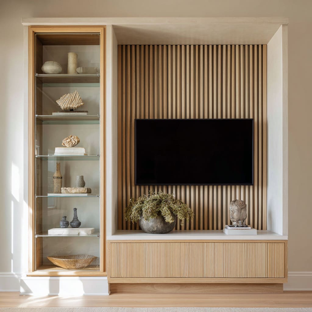 The TV can sit slightly lower within a tall opening. That isn’t a random proportion choice; it creates a calmer display box feeling, where the space above becomes intentional air rather than wasted emptiness.