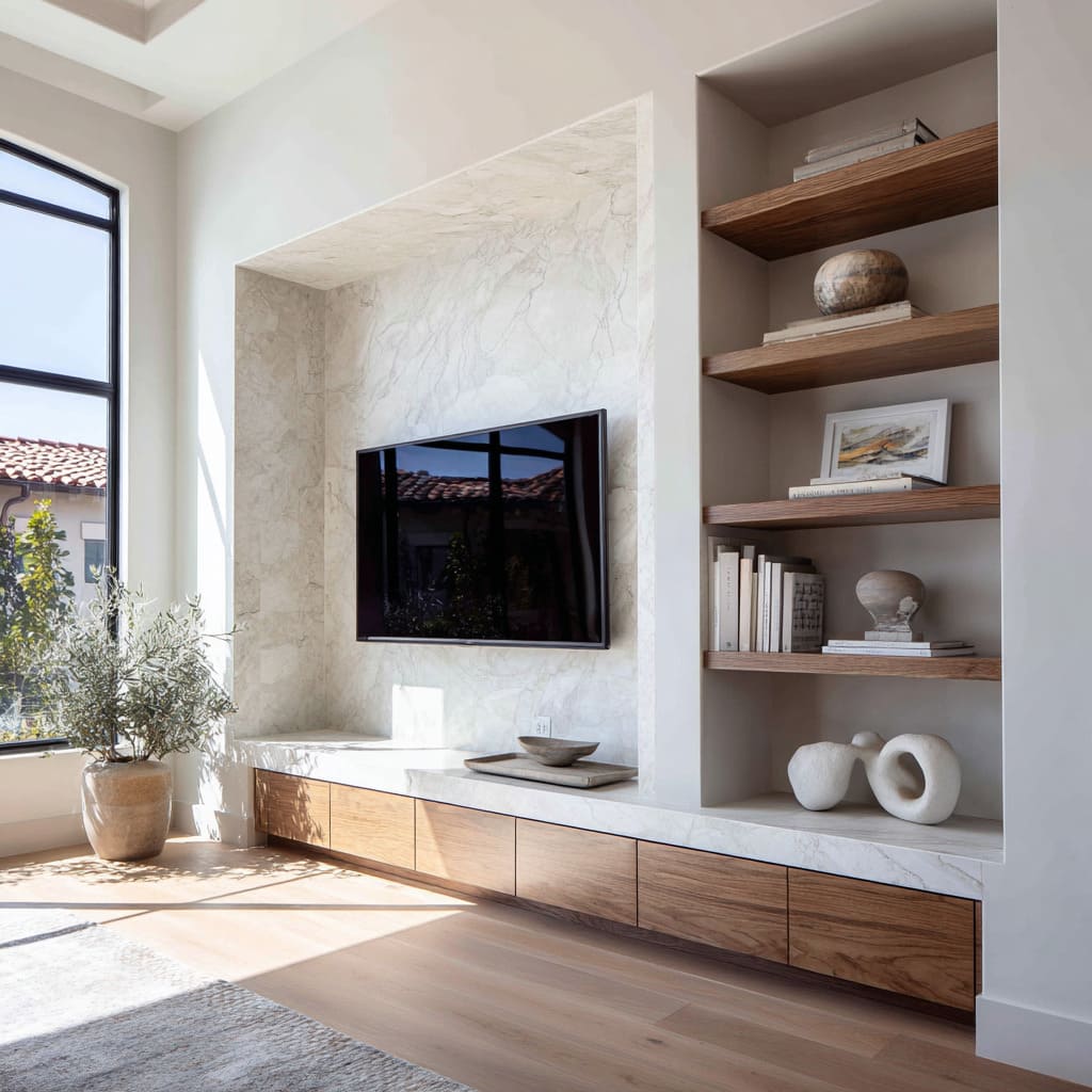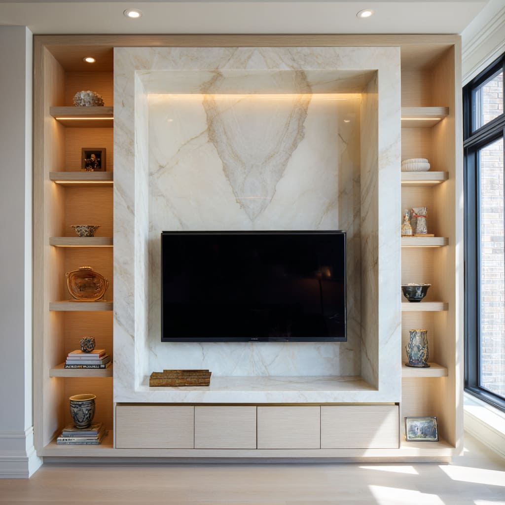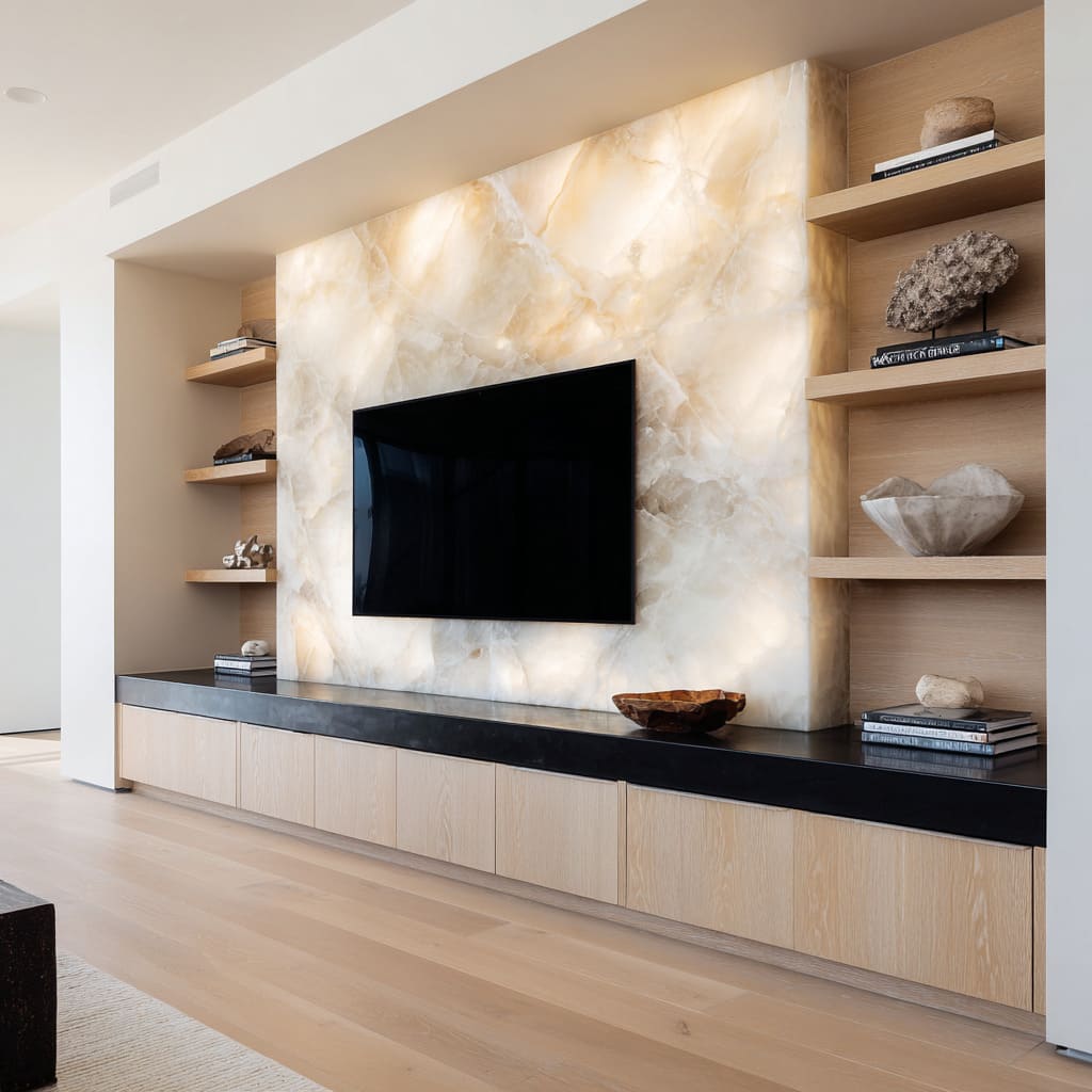 A common example is a pale, veined feature plane that feels softly luminous, where the TV is centered on that plane but the overall built-in is composed as multiple masses—so the TV is not the whole composition.