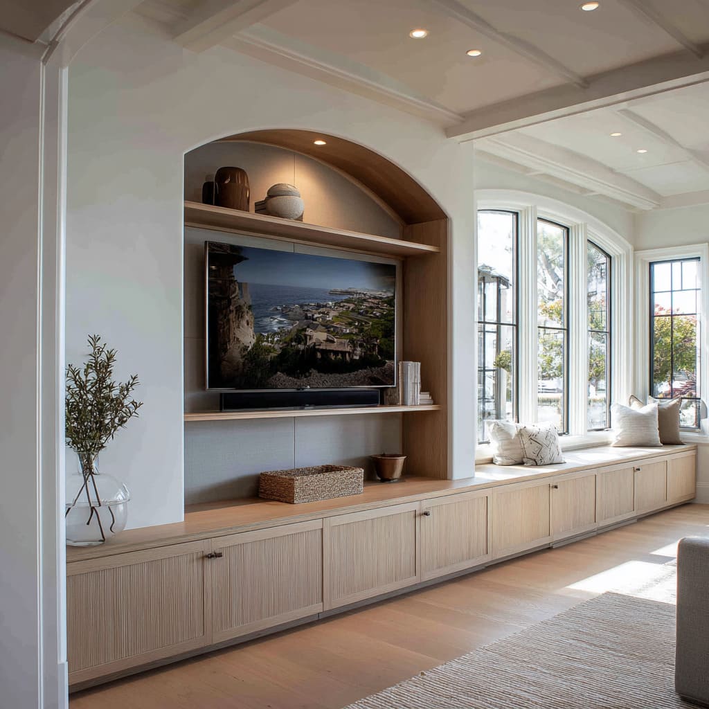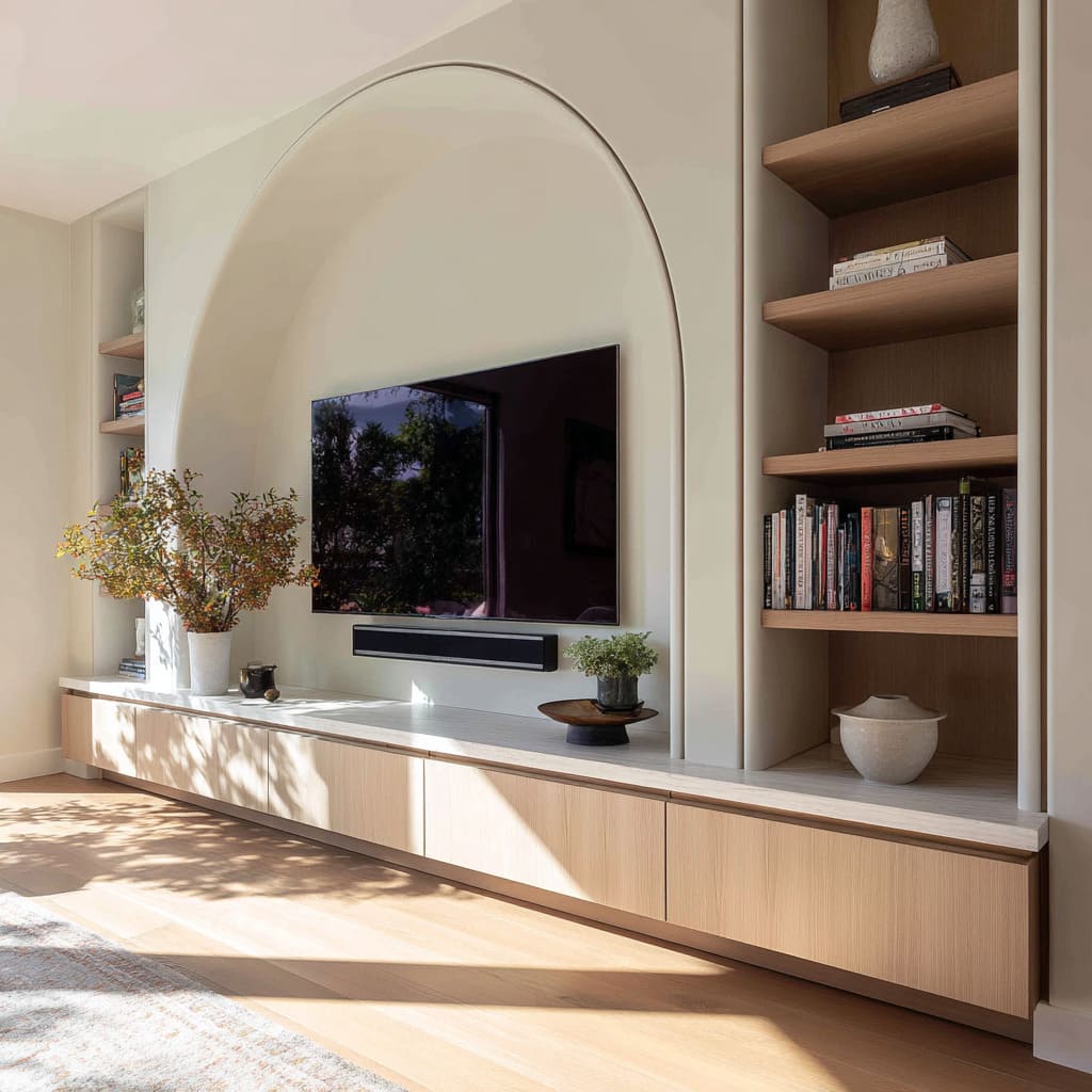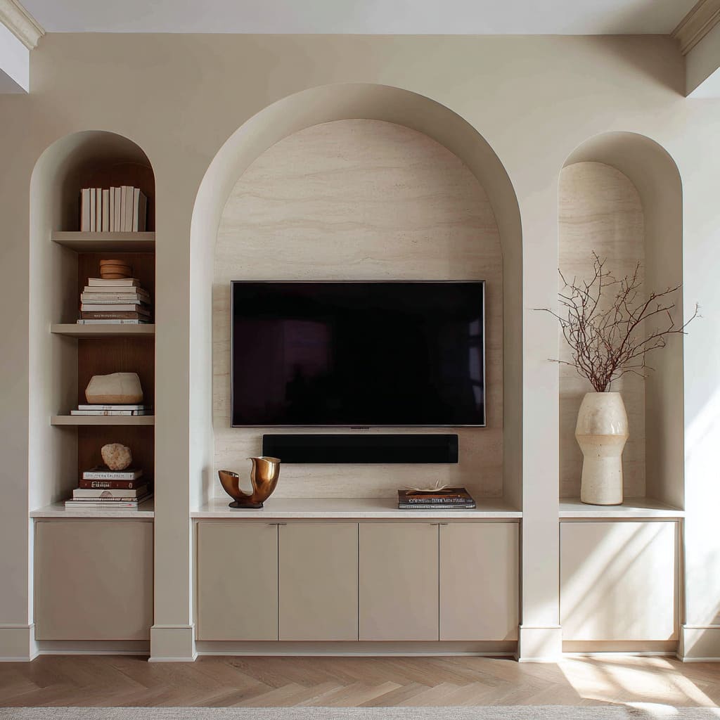 In multi-arch compositions, the strongest result tends to come from a clear center role for the TV niche, while side niches take on quieter identities (library mood on one side, still-life mood on the other).