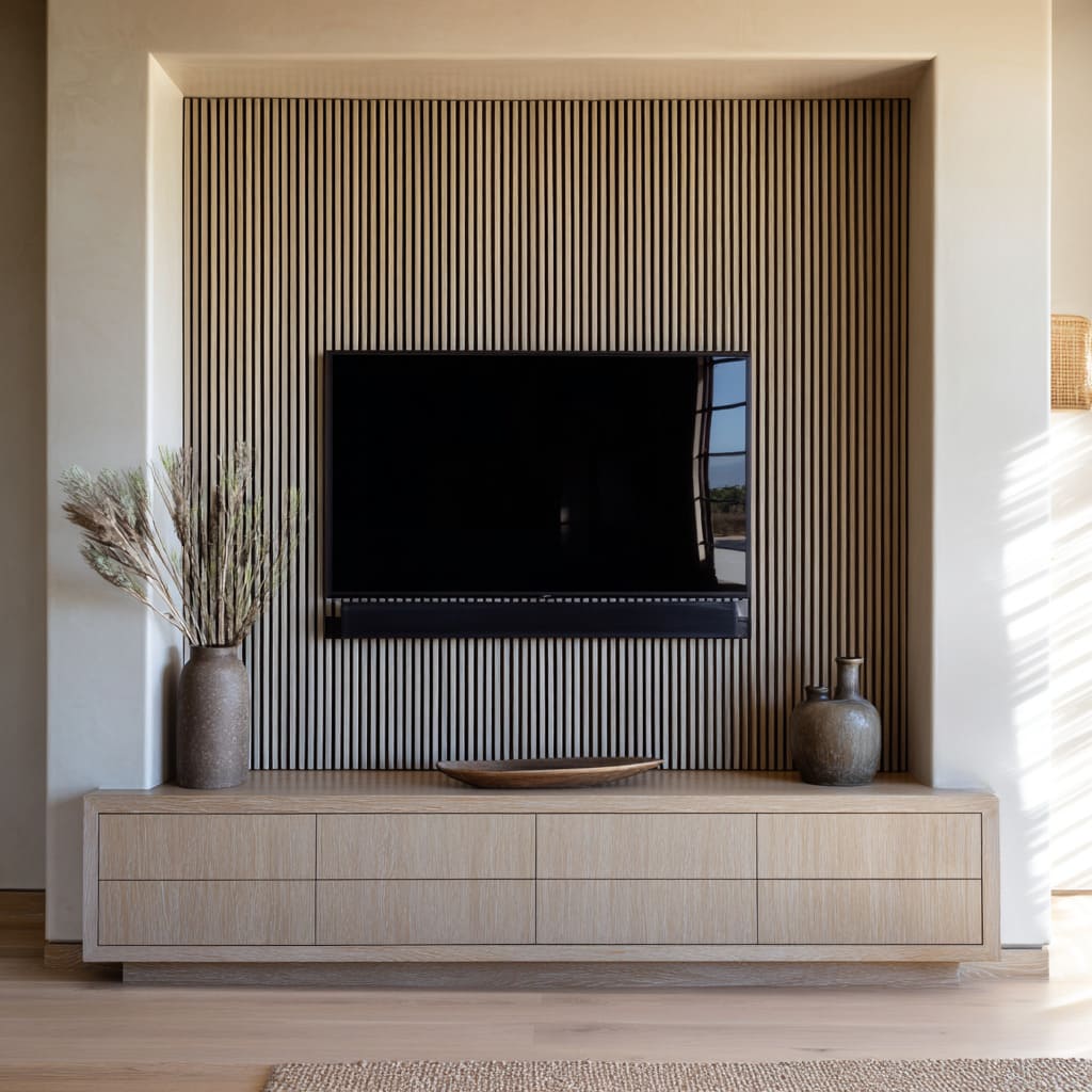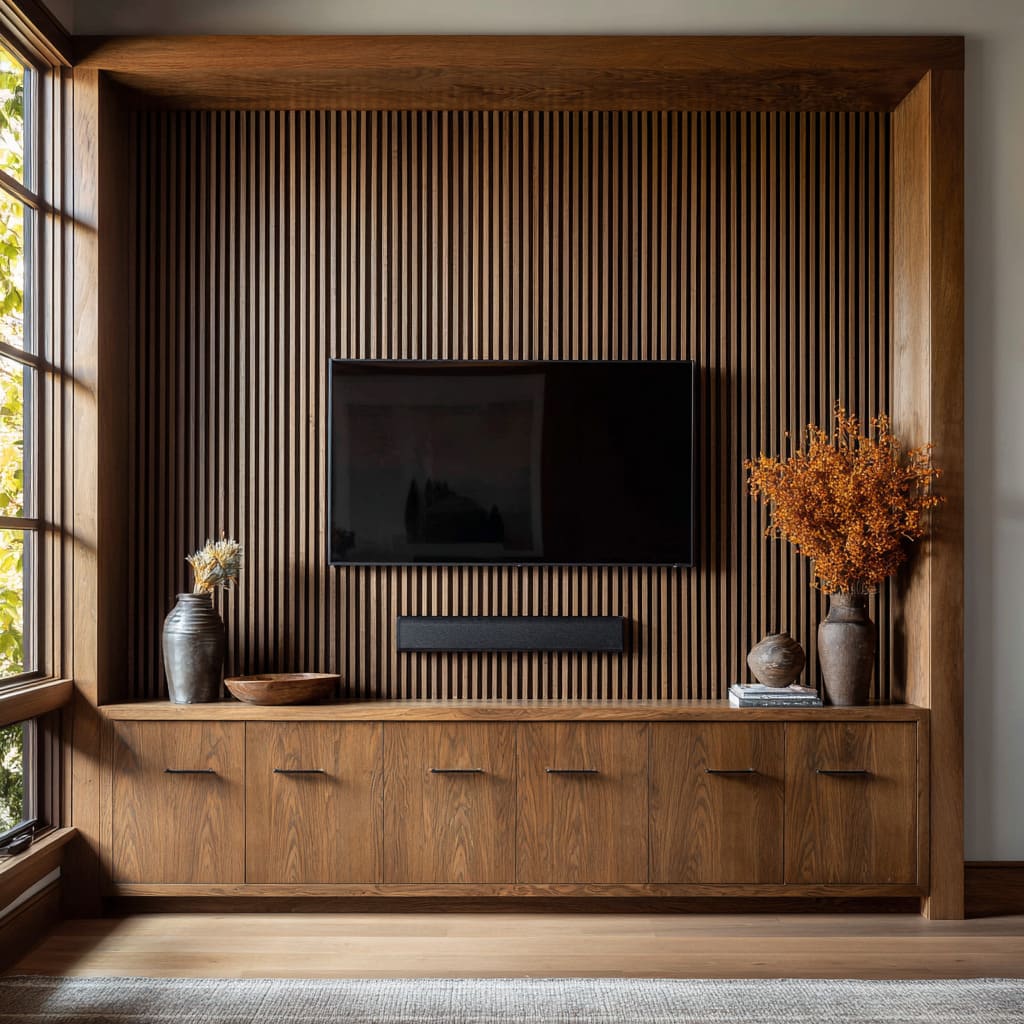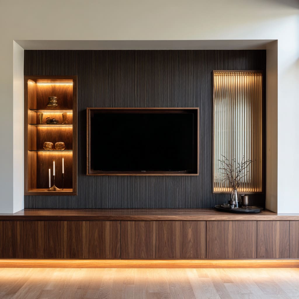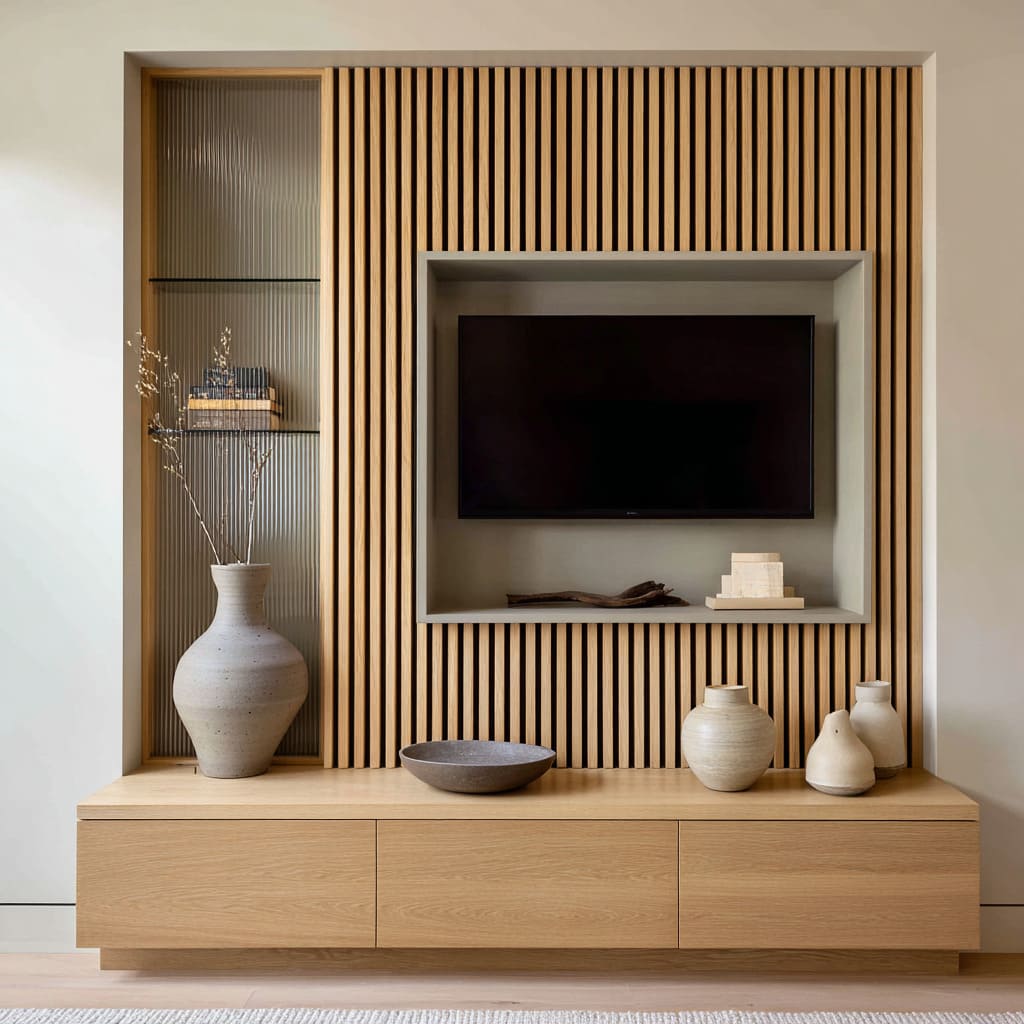 A particularly strong version is rhythm plus pause: a lively slat field paired with a smooth niche pocket, so the TV sits in the quiet zone while the texture lives beside it or behind it in a controlled way.