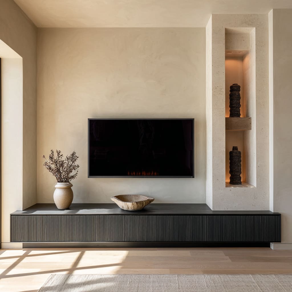 - The darkness is repeated elsewhere (a cabinet band, shadow pockets, a darker tower, a few sculptural objects), so the TV doesn’t feel like the only dark event in the room.
