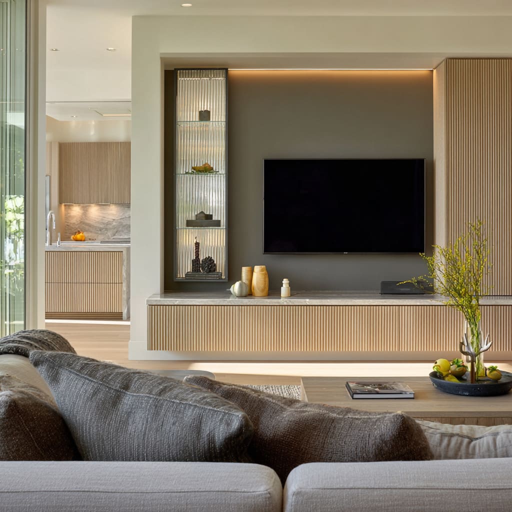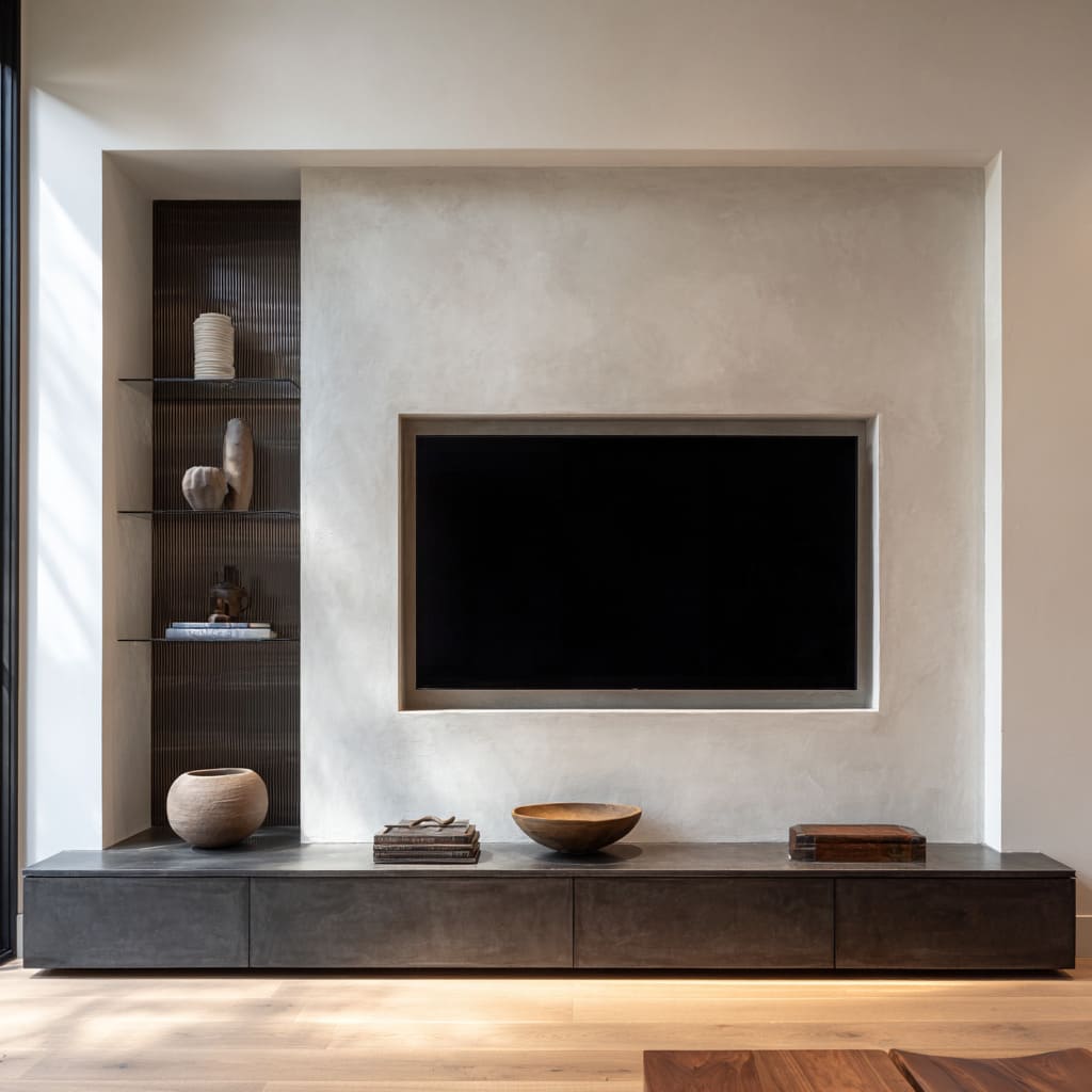 In open-plan layouts, the media wall often needs to do a second job: it has to prevent the living area from feeling visually dissolved into kitchen and circulation space. The niche becomes a pause—an intentional compression of the wall—so the living zone gains a clear identity.