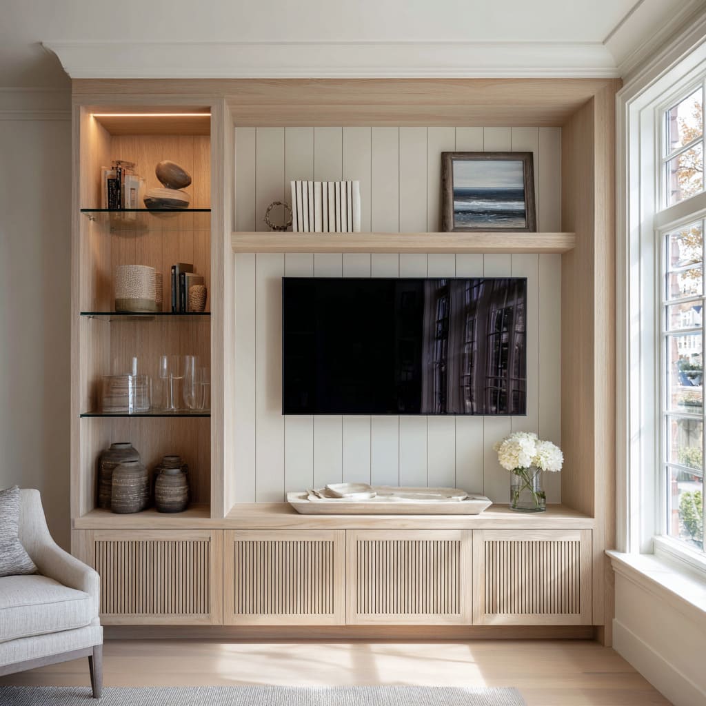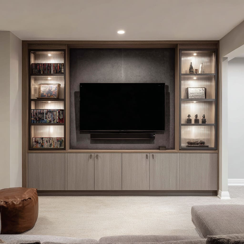 Ribbed or blurred glass appears again and again because it solves a very specific visual problem: the desire for display and storage near the TV without turning the wall into a collage of small items.