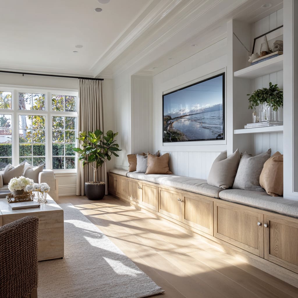 One of the effective strategies in family room desings is to give the media wall a second identity that feels equally real: a built-in bench zone.